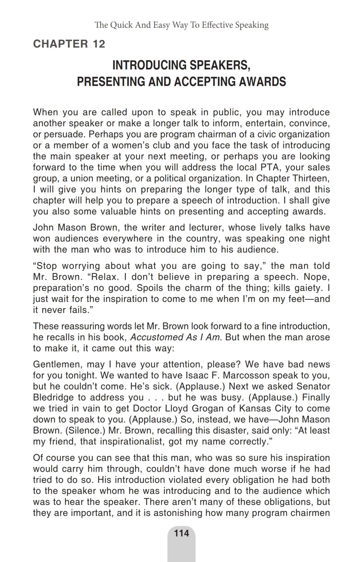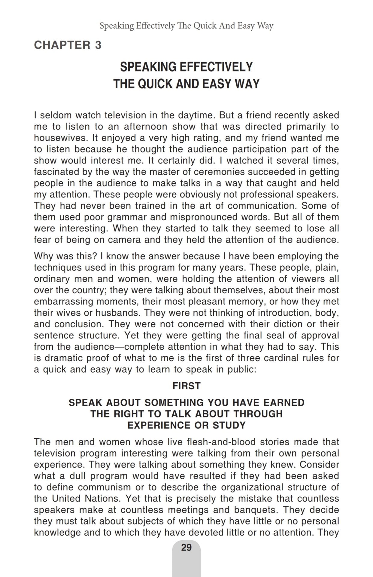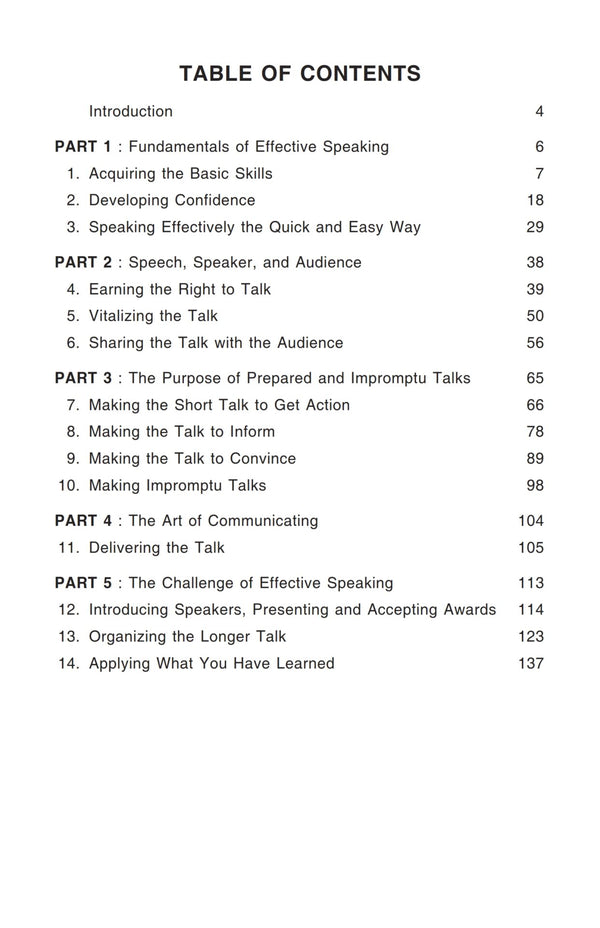 • One of the Dale Carnegie’s Bestseller "The Quick and Easy Way to Effective Speaking" has helped millions to speak effectively and confidently. This book will be helpful in all these ways, both to those who wish merely to function with greater ease and self-confidence in practical pursuits, and to those who wish to express themselves more completely as individuals seeking a deeper personal fulfillment.From acquiring basic skills to speaking effectively without fear of people, to the art of communicating and delivering speeches, this book will transform you into a powerful, effective and confident speaker. Also guide you through developing confidence, earning the right to speak, choosing your topic and organizing your thoughts and interacting with your audience. It also discusses how to convince people with your talk and impromptu speaking.In this book contents;Part one: Fundamentals of Effective SpeakingPart Two: Speech, Speaker, and AudiencePart Three: The Purpose of Prepared and Impromptu TalksPart Four: The Art of CommunicatingPart Five: The Challenge of Effective Speaking
