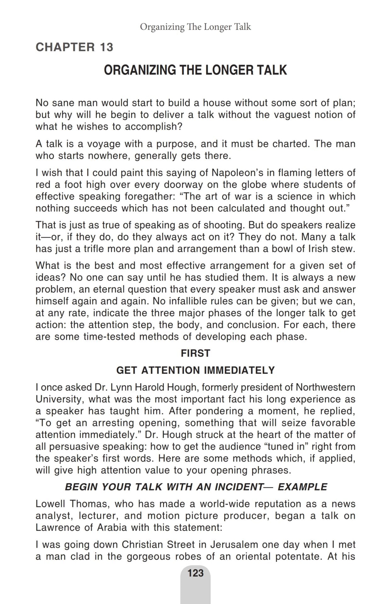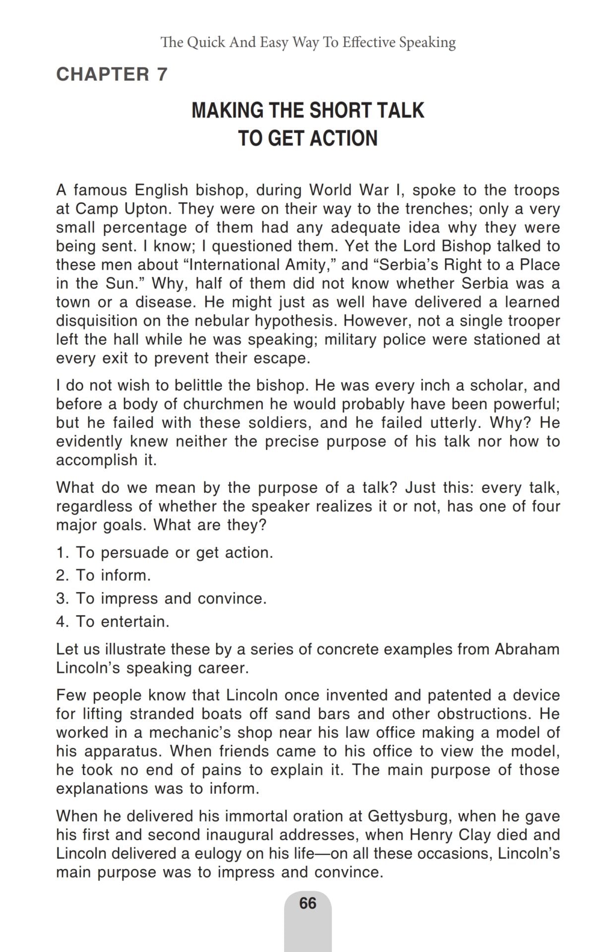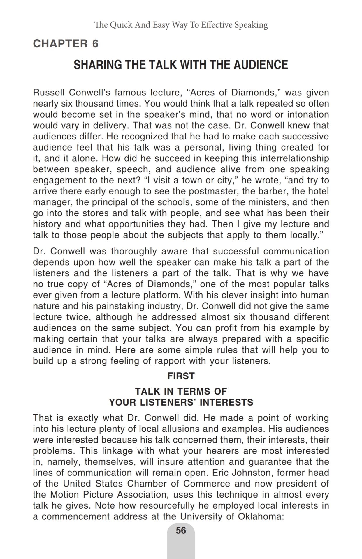 • One of the Dale Carnegie’s Bestseller "The Quick and Easy Way to Effective Speaking" has helped millions to speak effectively and confidently. This book will be helpful in all these ways, both to those who wish merely to function with greater ease and self-confidence in practical pursuits, and to those who wish to express themselves more completely as individuals seeking a deeper personal fulfillment.From acquiring basic skills to speaking effectively without fear of people, to the art of communicating and delivering speeches, this book will transform you into a powerful, effective and confident speaker. Also guide you through developing confidence, earning the right to speak, choosing your topic and organizing your thoughts and interacting with your audience. It also discusses how to convince people with your talk and impromptu speaking.In this book contents;Part one: Fundamentals of Effective SpeakingPart Two: Speech, Speaker, and AudiencePart Three: The Purpose of Prepared and Impromptu TalksPart Four: The Art of CommunicatingPart Five: The Challenge of Effective Speaking