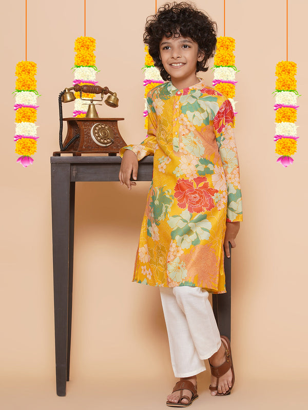 Boys Yellow Printed Straight Kurta with Pyjamas Has a Collar Neck, Long Sleeves