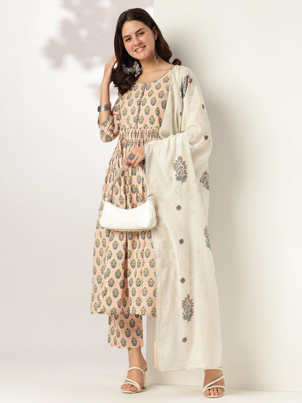 Janasya Light Cotton Floral ALine Kurta Set Top Fabric: Cotton Top Style: ALine Top Color: Light Top Pattern: Floral Top Neck: Round Neck Top...