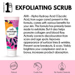 BRIGHTENING & PURIFYING EXFOLIATING SCRUB AHA - Alpha Hydroxy Acid (Glycolic Acid, from sugar cane) present in this formula, comes with various benefits for your skin. This formula has primarily been made to exfoliate. But it also helps promote collagen and blood flow. Actively corrects discoloration from scars and age spots. Improves the appearance of surface lines and wrinkles. Prevent acne breakouts, and scars. Visibly brightens your complexion and as a bonus, increases product absorption.
