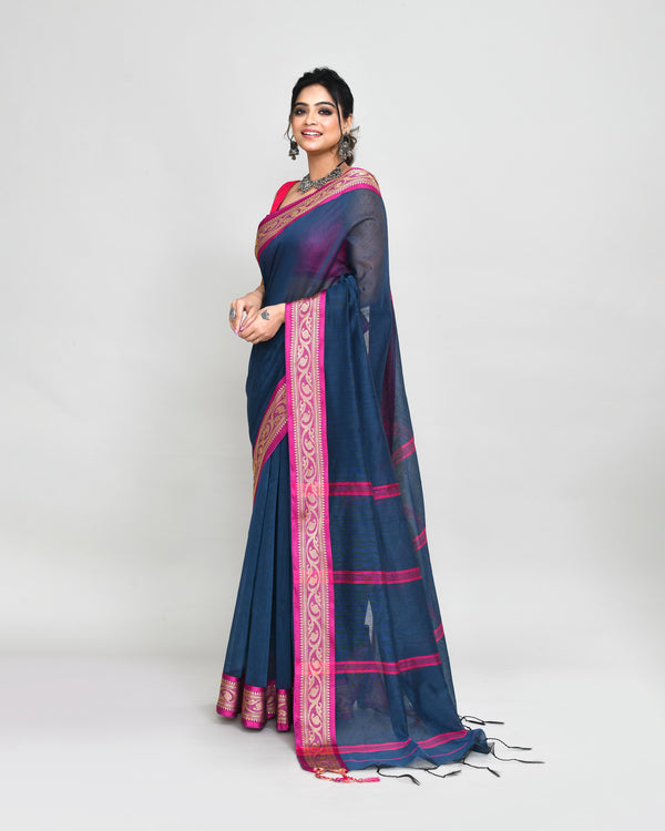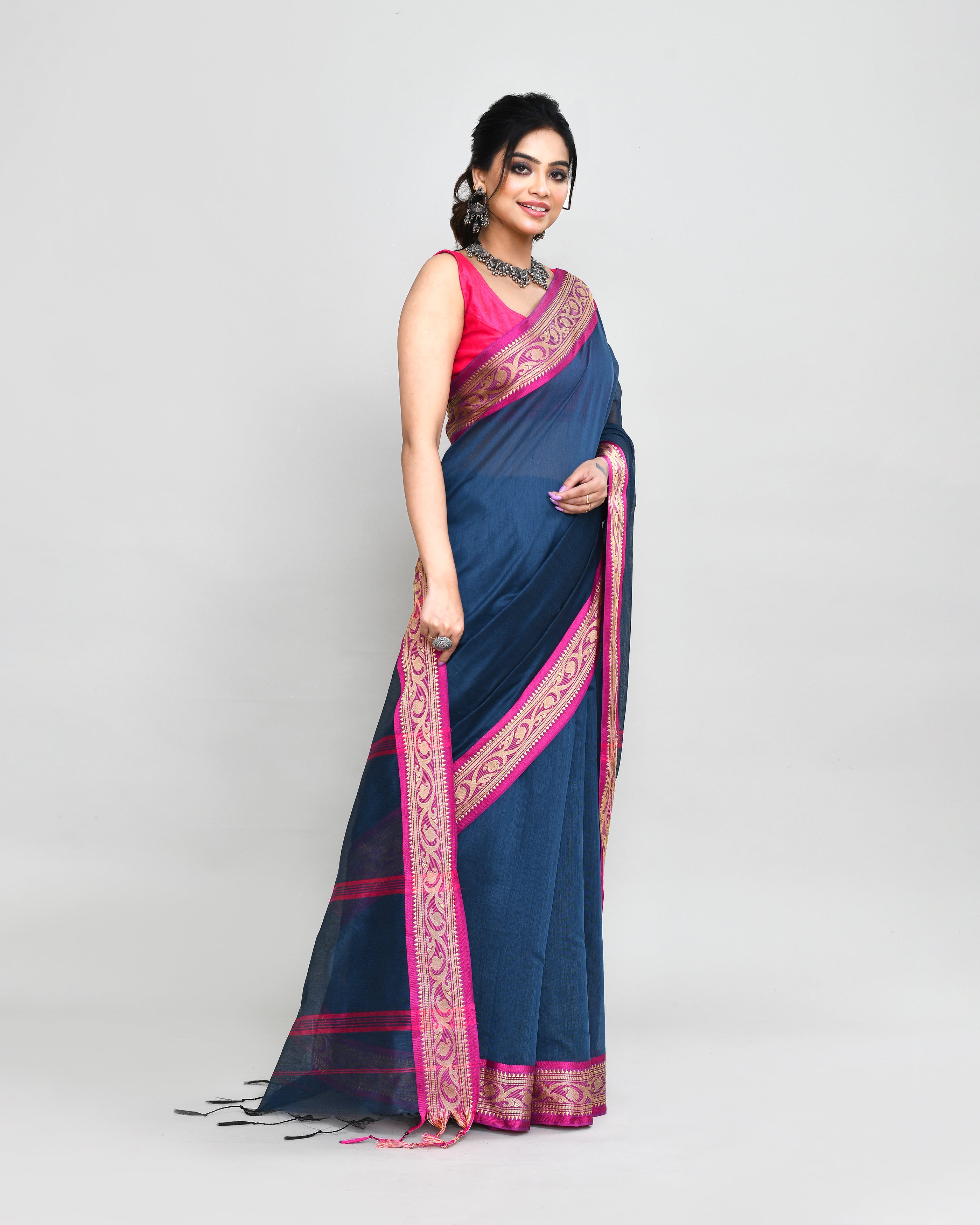 A fresh and vibrant addition to your wardrobes! This saree is crafted in Cotton Handspun that features beautiful shades that will give you zesty vibes! Style this up with minimal jewelry for a fab look!