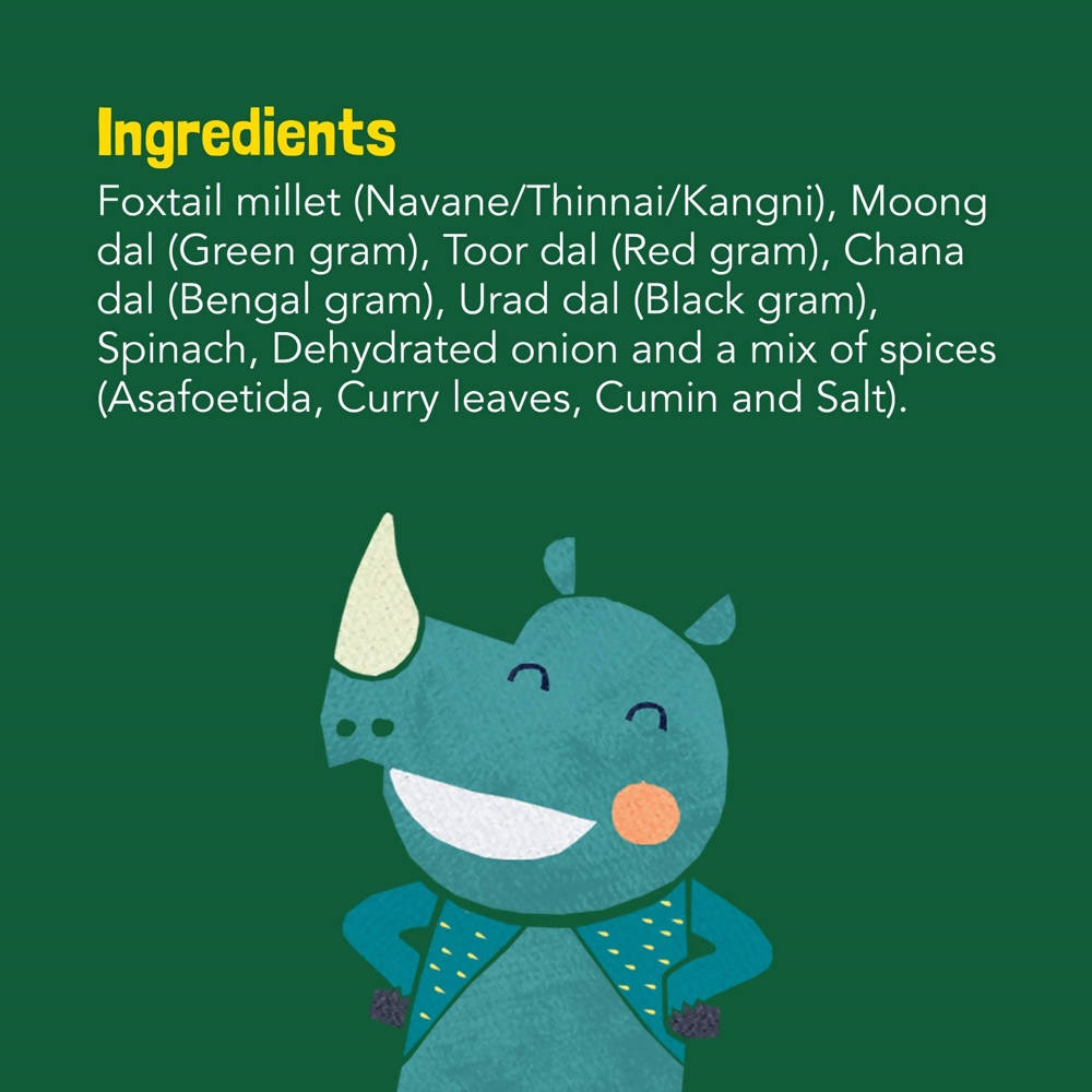 Foxtail Millet, Moong Dal (Green Gram), Toor Dal (Red Gram), Chana Dal (Bengal Gram), Urad Dal (Black Gram), Spinach, Dehydrated Onions And A Mix Of Spices (Asafoetida, Curry Leaves, Cumin And Salt)