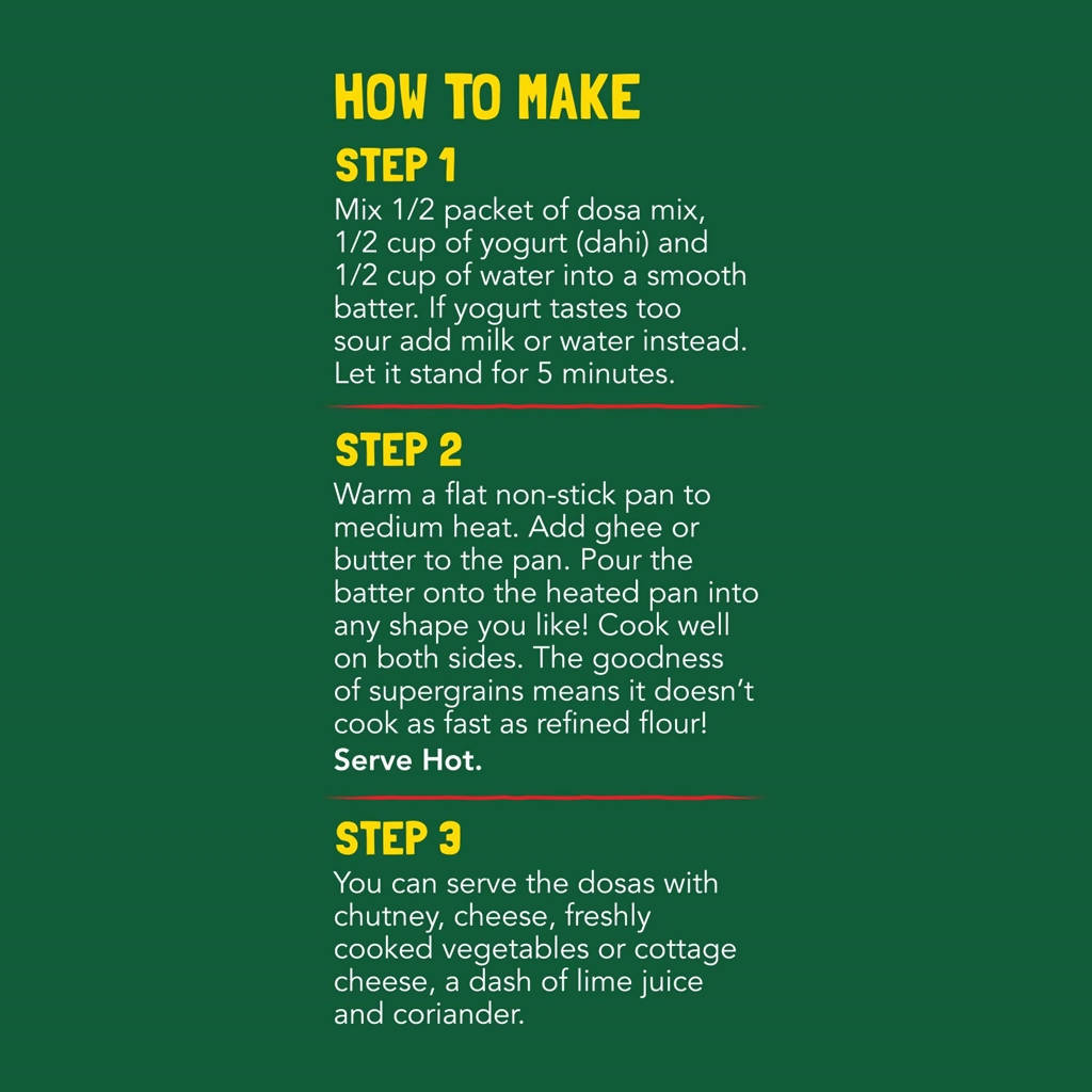 Step 2: Warm a flat and non-stick pan to medium heat. Add ghee or butter to the pan. Pour the batter onto the heated pan into any shape you like! Cook well on both sides. The goodness of super grains means it does not cook as fast as refined flour. |