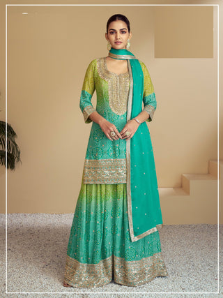 Aarshi Fashions Yellow & Sea green Bandhani Embroidered Palazzo Salwar Kameez