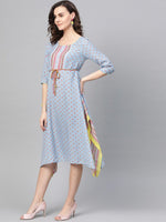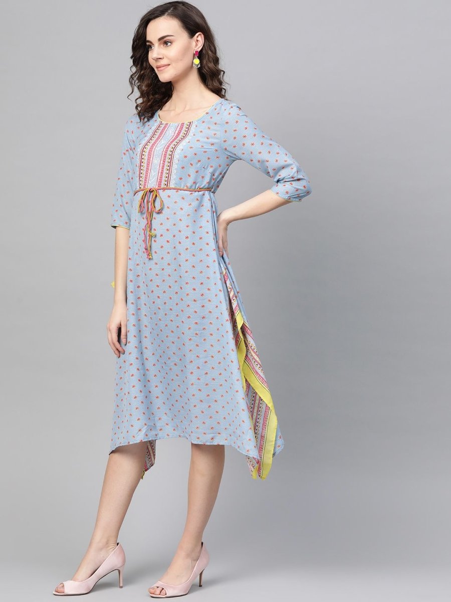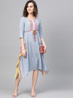Blue and red printed woven A-line dress, has a round neck, three-quarter sleeves, and asymmetric hem