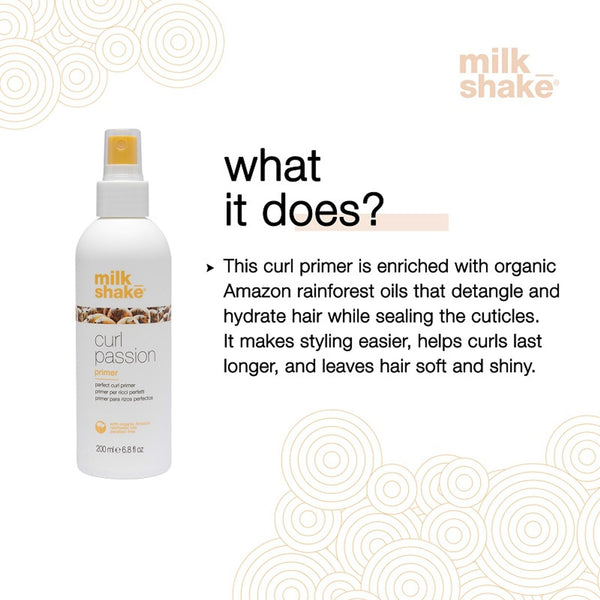 Milkshake curl passion primer is a perfect curl primer. Detangles and hydrates curls while sealing the cuticles. It facilitates the styling of the curls which last longer, leaving the hair soft and shiny. It can also be used the day after styling to revive curls. Ideal for blow-drying with a brush or diffuser.