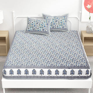 Blue White Elephant Design Cotton 200TC King Bedsheet With 2 Zipper Pillow Covers - King Size by House of Ree - Distacart
