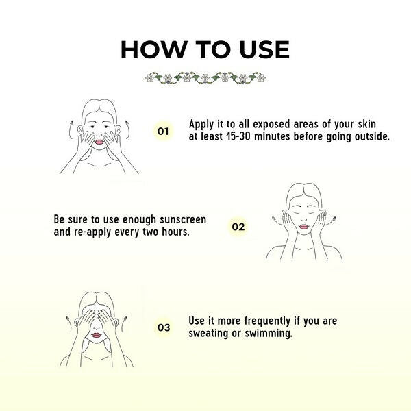• Apply liberally to all exposed areas of the skin 15-30 minutes before sun exposure. Reapply every two hours, or more frequently if sweating or swimming.