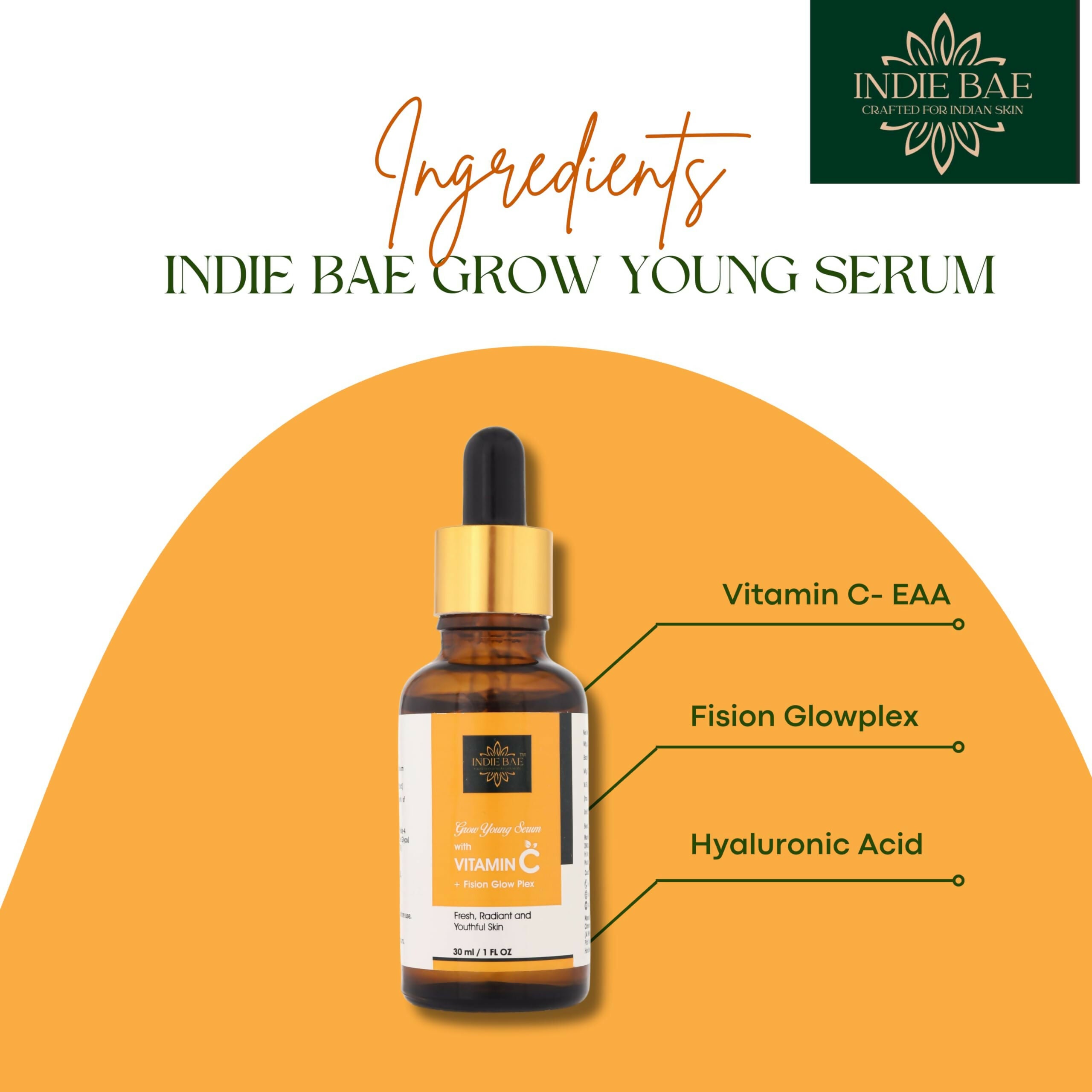 Indie Bae Crafted For Indian Skin: Grow Young Serum with Vitamin C and Fision GlowplexAbout the Product: Visible results within 2 weeks 1st time in...