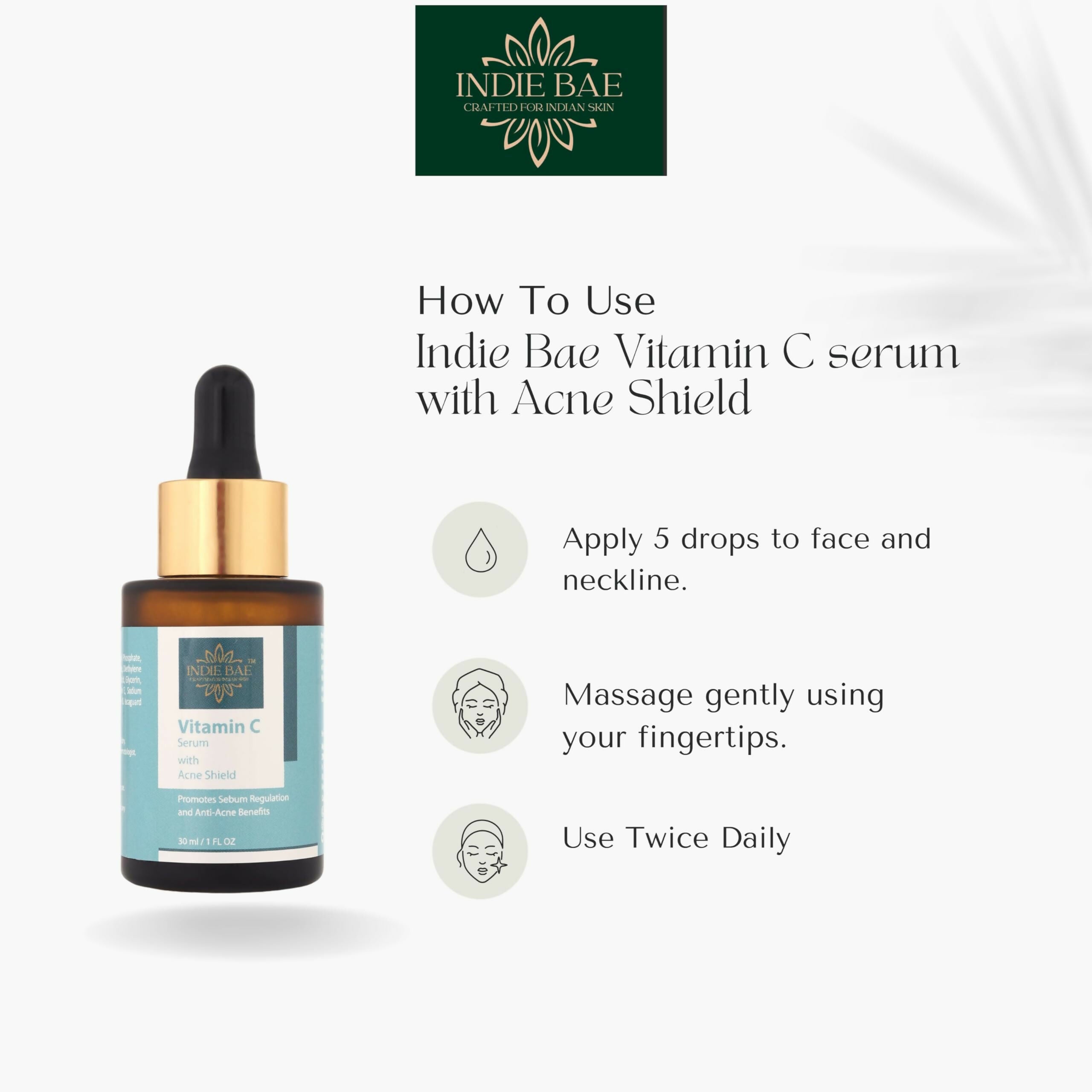 Indie Bae Crafted For Indian Skin: Vitamin C Serum With Acne ShieldAbout the Product: Provides anti-acne benefits unique to SAP, aiding in both bri...