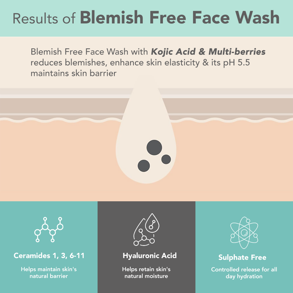 • Lotus DermaBotanics Kojic Acid + Multi Berry Blemish-Free Facewash, expertly crafted with the guidance of dermatologists to target pigmentation, dark spots, and acne. This unique formula combines the powerful lightening properties of Kojic Acid with a potent blend of berry extracts, including Strawberry, Raspberry, Blueberry, Cranberry, and Acai Berry, known for their antioxidant benefits and skin-soothing abilities. Gentle on the skin, this sulfate-free face wash maintains a pH level 5.5 thanks to its advanced blemish-fighting solution.