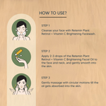 • Apply 2-3 drops of the Retemin Plant Retinol + Vitamin-C Brightening Facial Oil to the face and neck, and gently smooth into the skin.