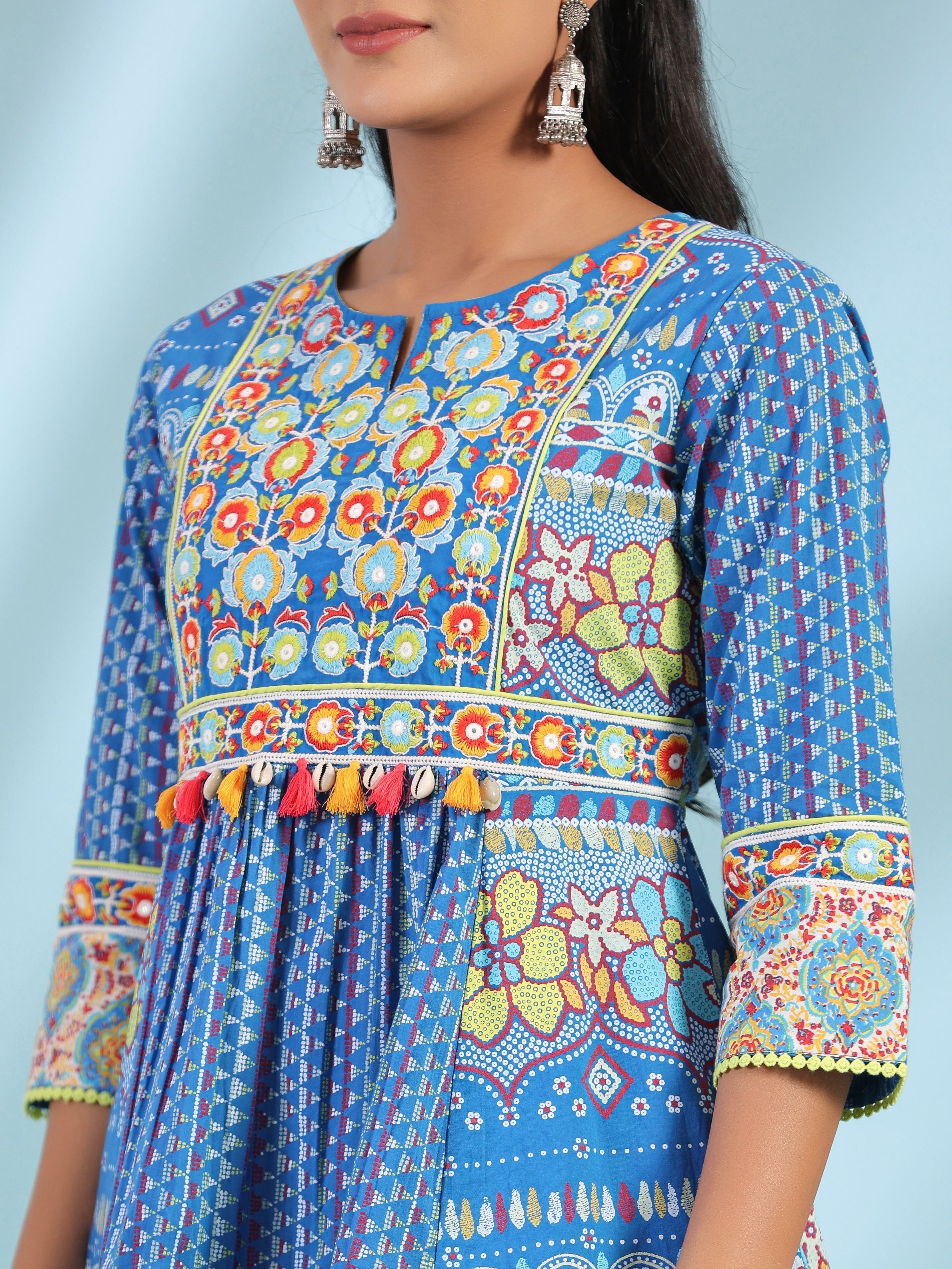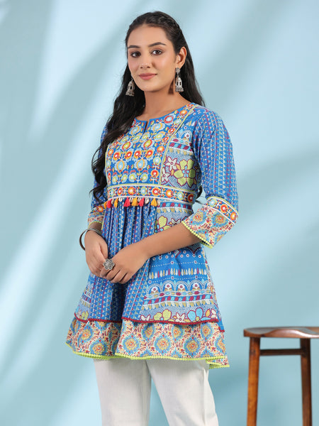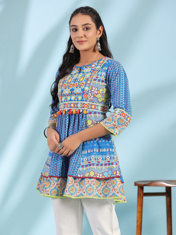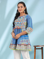 The Sujani blue pure cotton peplum tunic featuring floral print with intricate embroidery. Designed with gathers, a straight silhouette falling above the knee, peplum style, notch neckline, slip-on style, and adorned with beautiful thread work for added elegance.