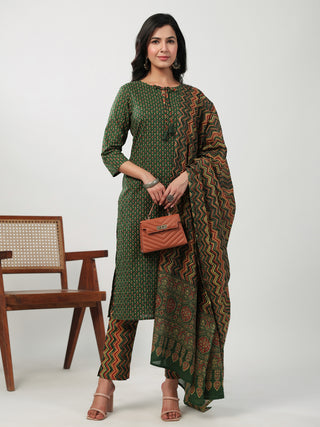 Janasya Regular Chinnon Green Ethnic Motifs V-Neck Kurta,Bottom & Dupatta
