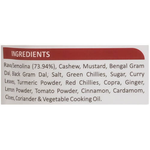 • Rava, Cashew Nuts, Mustard, Bengal Gram Dal, Black Gram Dal, Salt, Green Chillies, Sugar, Curry Leaves, Turmeric, Red Chillies, Copra, Coriander, Ginger, Lemon Powder, Tomato Powder, Cinnamon, Cardamom, Cloves, Vegetable Cooking Oil