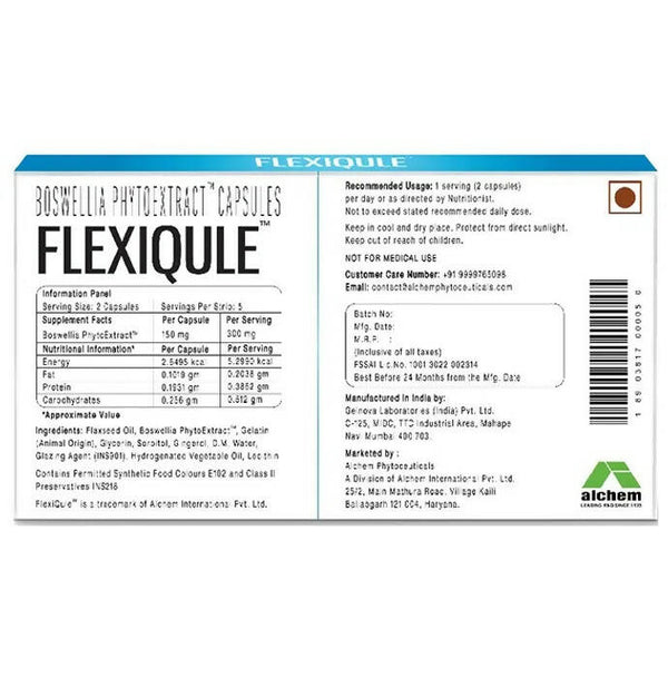 Alchem Life Flexiqule Capsules Ingredients: Boswellia Phytoextract Gingerol Flaxseed oil Directions For Use:2 capsules per day or as suggested by ...