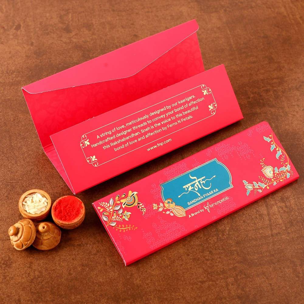 • This Rakhi comes with a Beautiful Traditional Sneh Triple Fold Rakhi Packaging