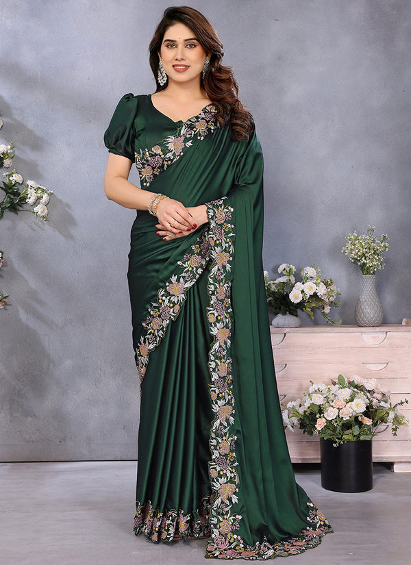 This elegant saree is crafted from premium satin fabric in a rich dark green shade, giving it a lustrous drape. The saree is enhanced with delicate embroidery work along the border and pallu, offering a timeless designer appeal. Measuring 5.50 meters in length, it ensures graceful pleating and draping for traditional or modern styles. Paired with a 0.80 meter blouse piece, this saree is perfect for festive gatherings, weddings, and evening occasions.