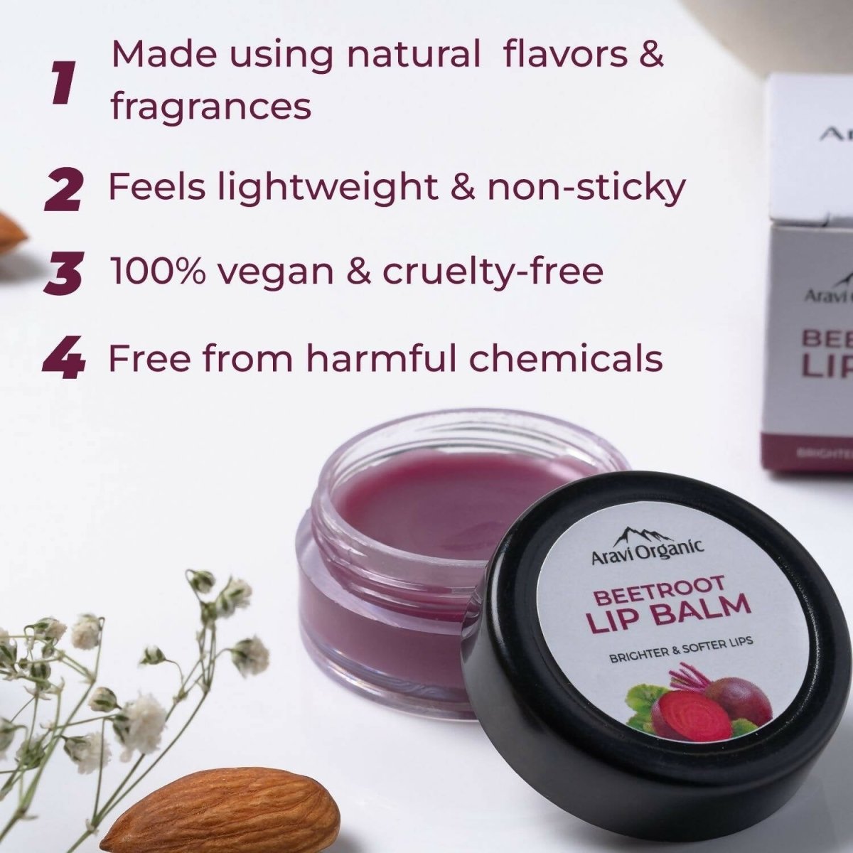 • Aravi Organic Beetroot Lip Balm is a natural blend of beetroot, cocoa butter, almond oil and vitamin E to help dry and chapped lips. This lip balm keeps your lips protected and beautifully soft and nourished. The lightweight formulation doesn't appear as a thick greasy layer on the lips but penetrates deep into the lips and thoroughly nourishes it. It is a chemical-free lip balm that is suitable for use in all seasons due to its high moisturizing properties.