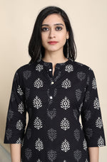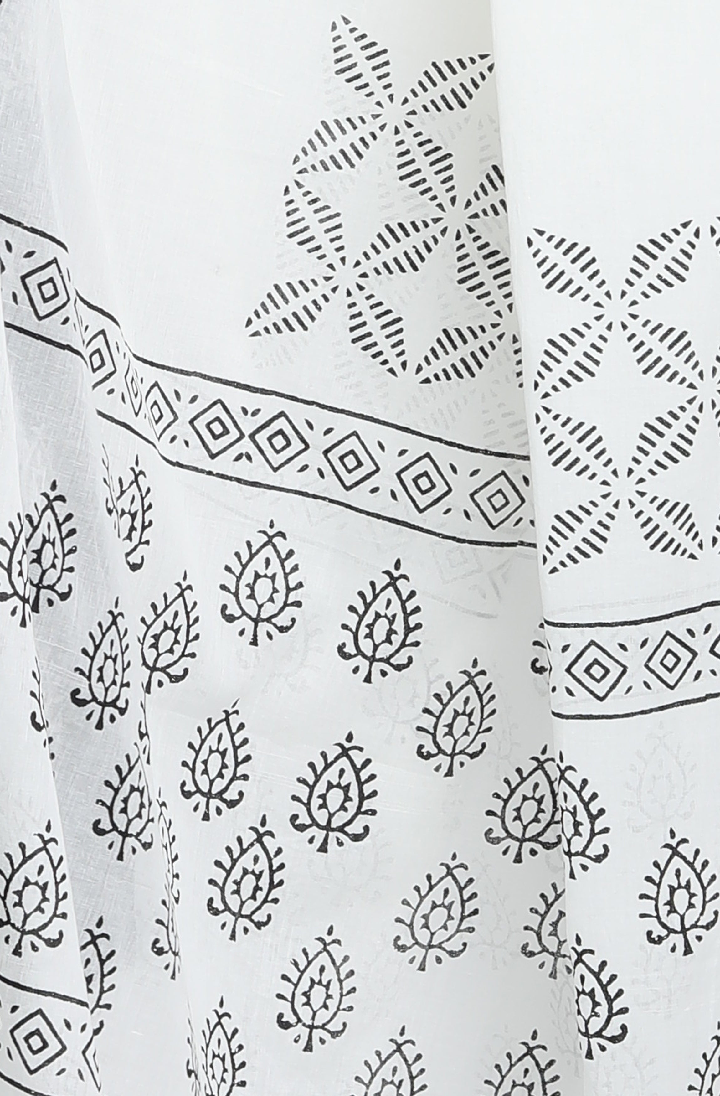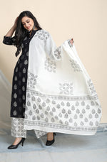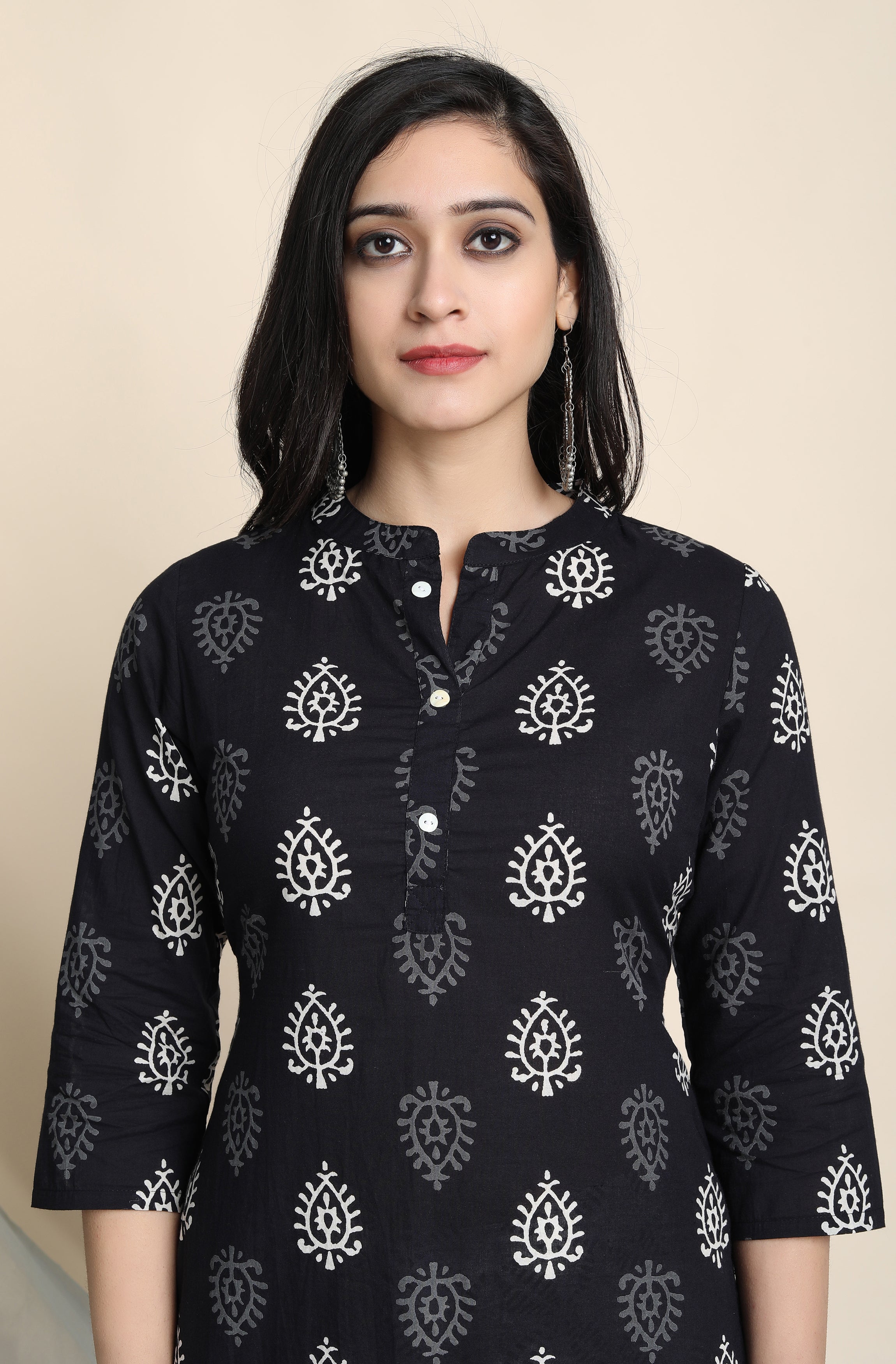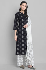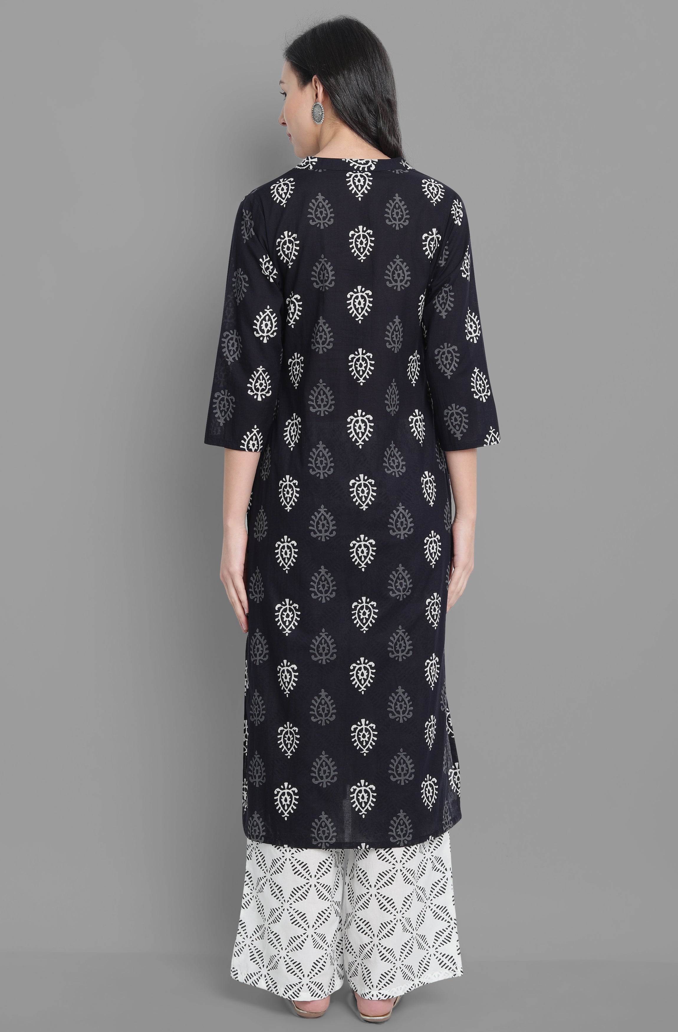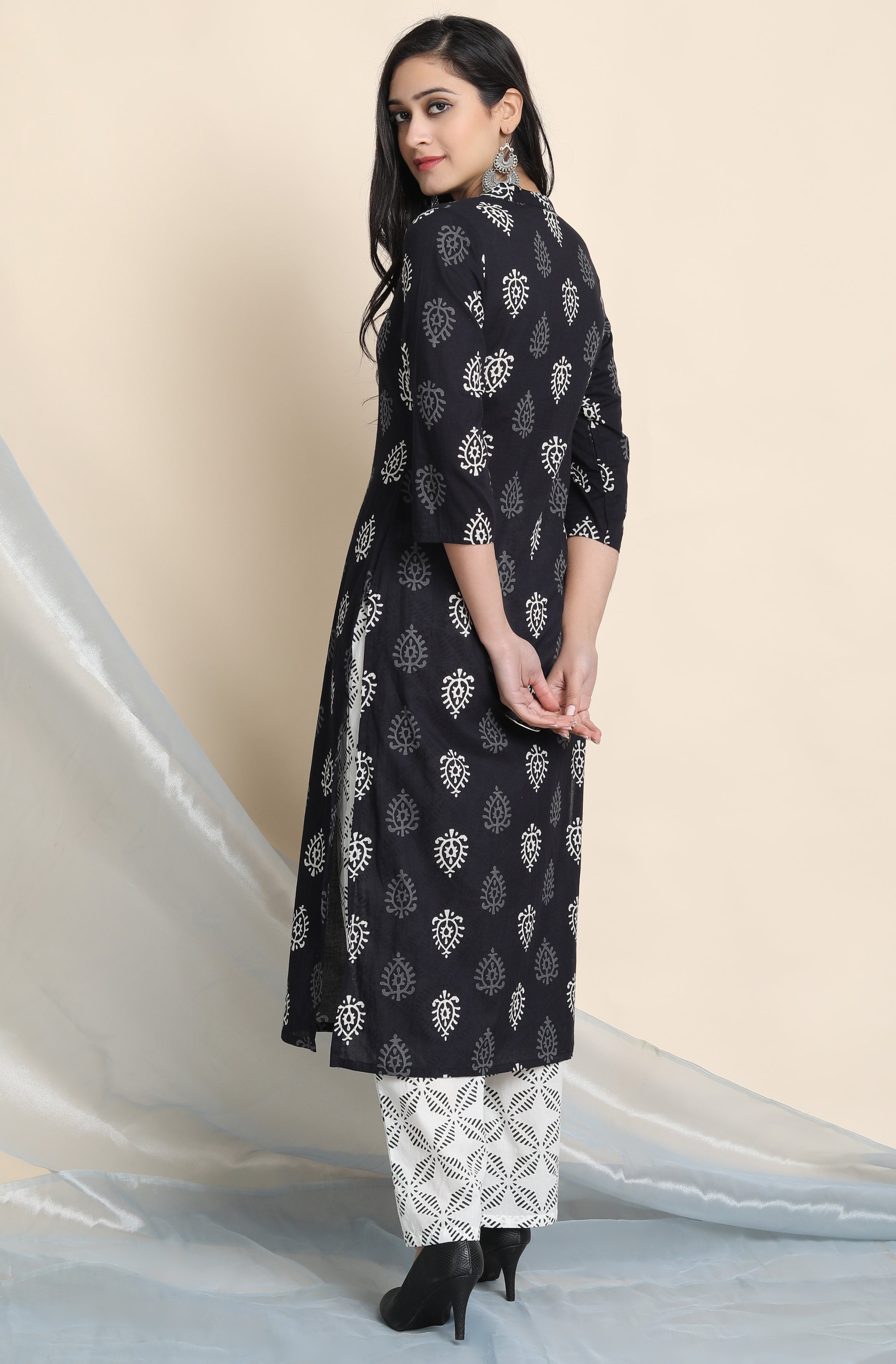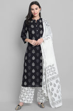 Flaunt your style by wearing this super comfortable cotton kurta by janasya. Featuring mandarin collar with mock button placket, three quarter sleeve, straight style with all-over block print. It comes with off-white partially elasticated palazzo also made in cotton. And what's more??? it also has cotton block printed dupatta to complete your look. Style this set with oxidized jhumkas to complete your look.