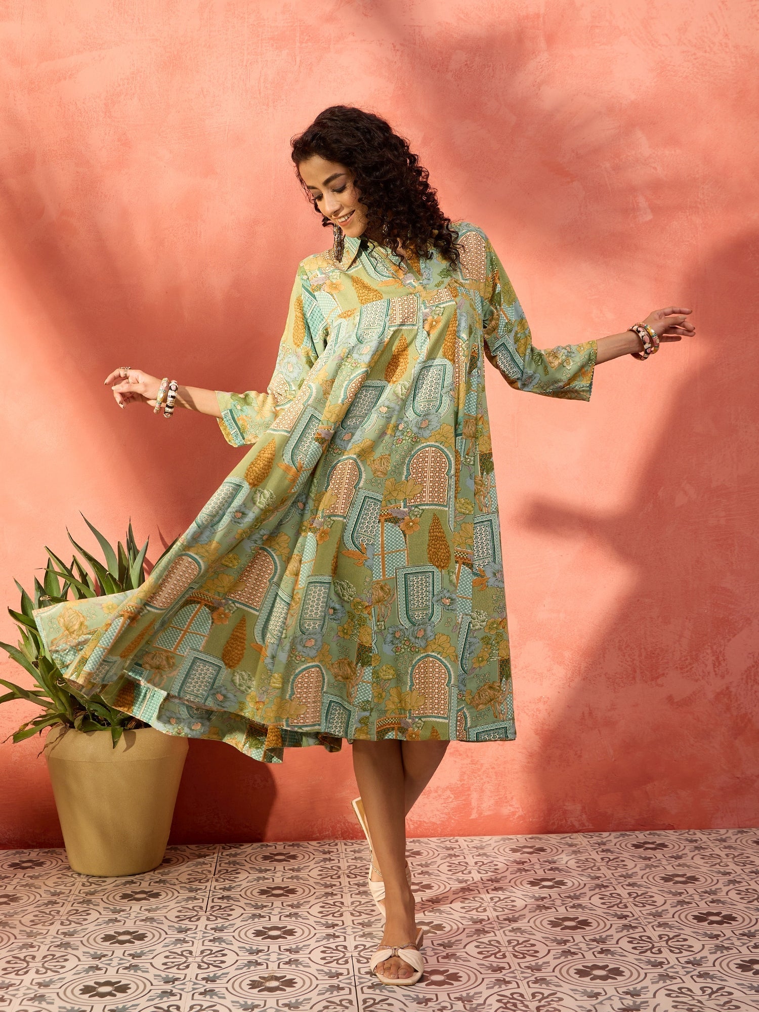 InWeave Pear Green Window Floral Flared Collar Dress