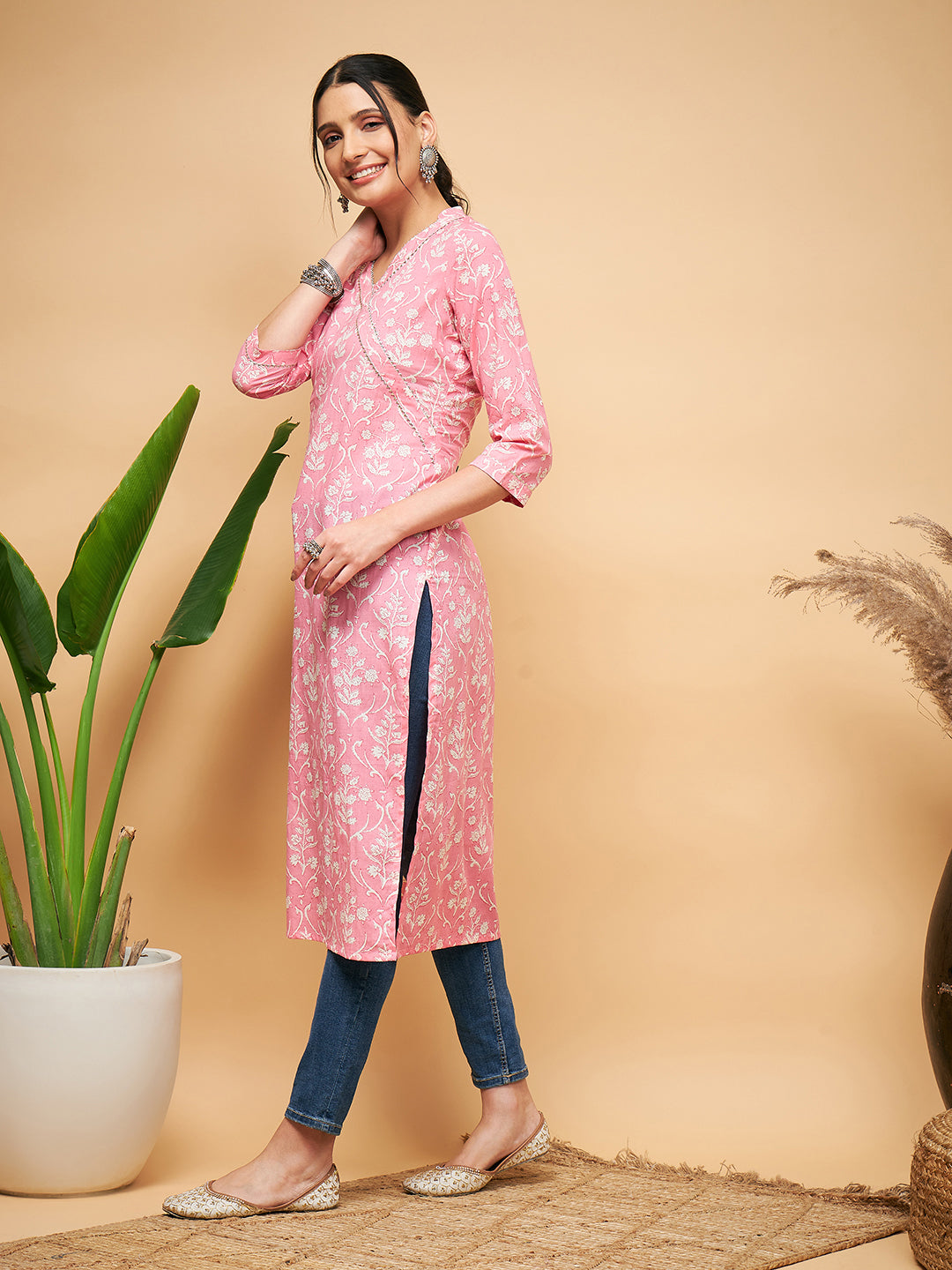 Inweave Women's Light Pink Floral Print Straight Angrakha Gota KurtaKeep it classy all year long with stylish Kurtas from InWeave, dress up for you...