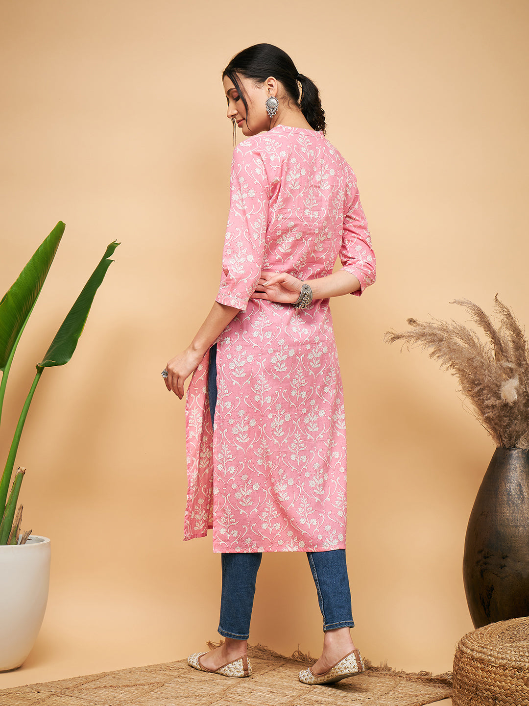 InWeave Women's Light Pink Floral Print Straight Angrakha Gota Kurta - S