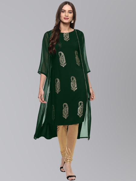 Janasya Women's Bottle Green Crepe Foil Print Festive A-Line Kurta Color: Bottle Green Fabric: Crepe Work/Pattern: Foil Print Occasion: Fes...