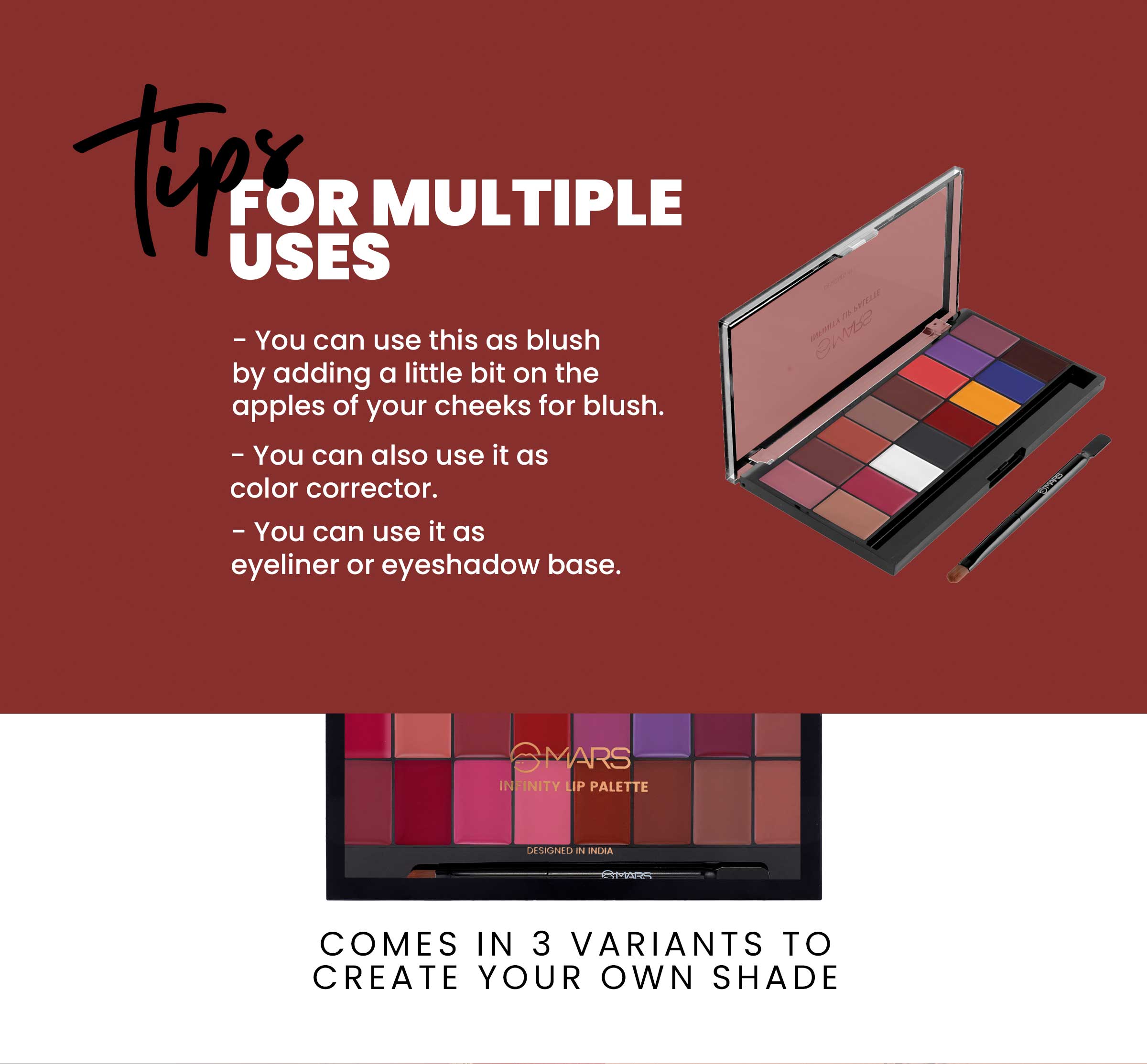 MARS Cosmetics Infinity Lip Palette with Spatula cum Applicator - 02 MulticolorAbout The Product: Ingredients:Ethylhexyl Palmitate, Aluminum St...