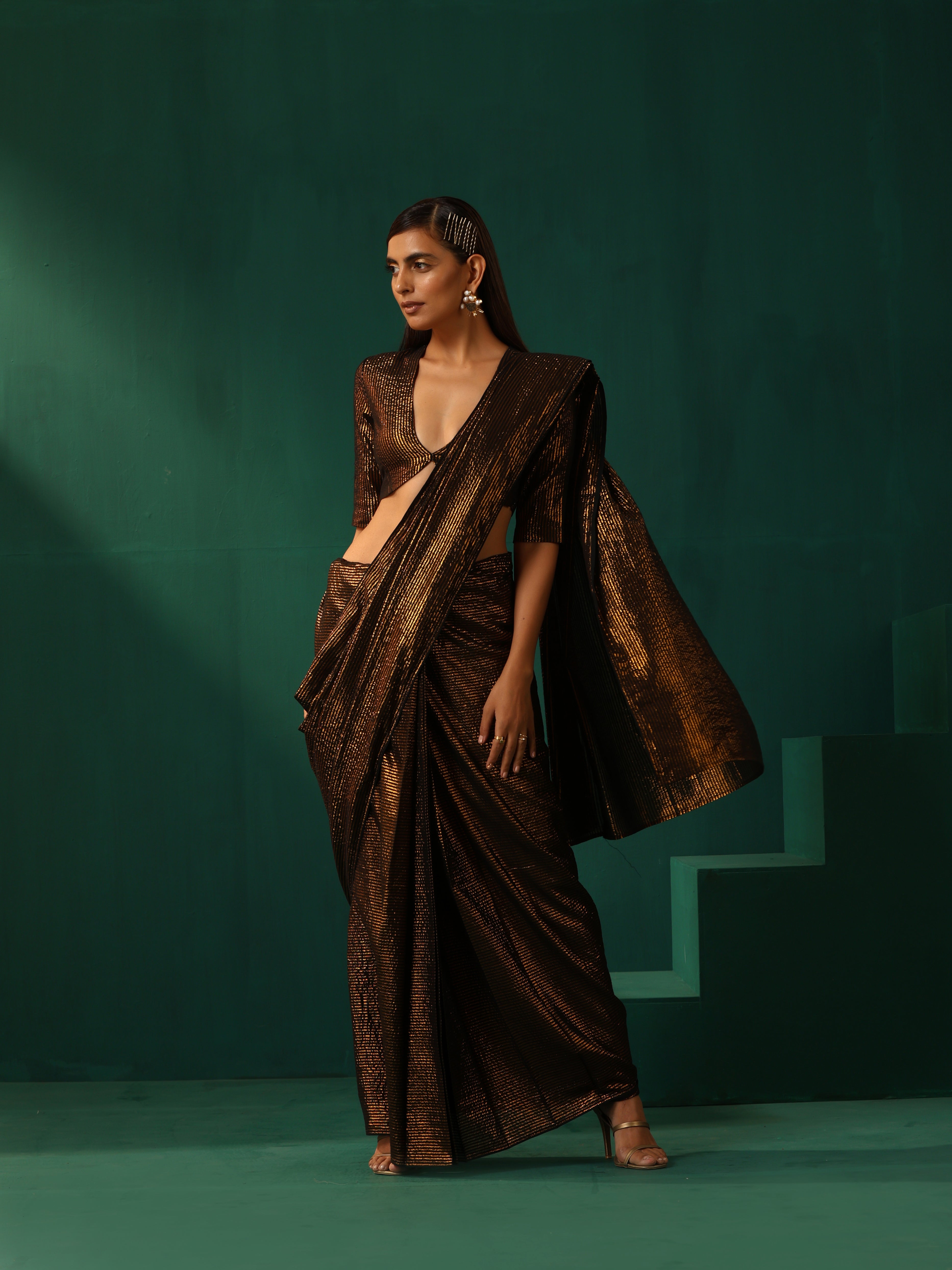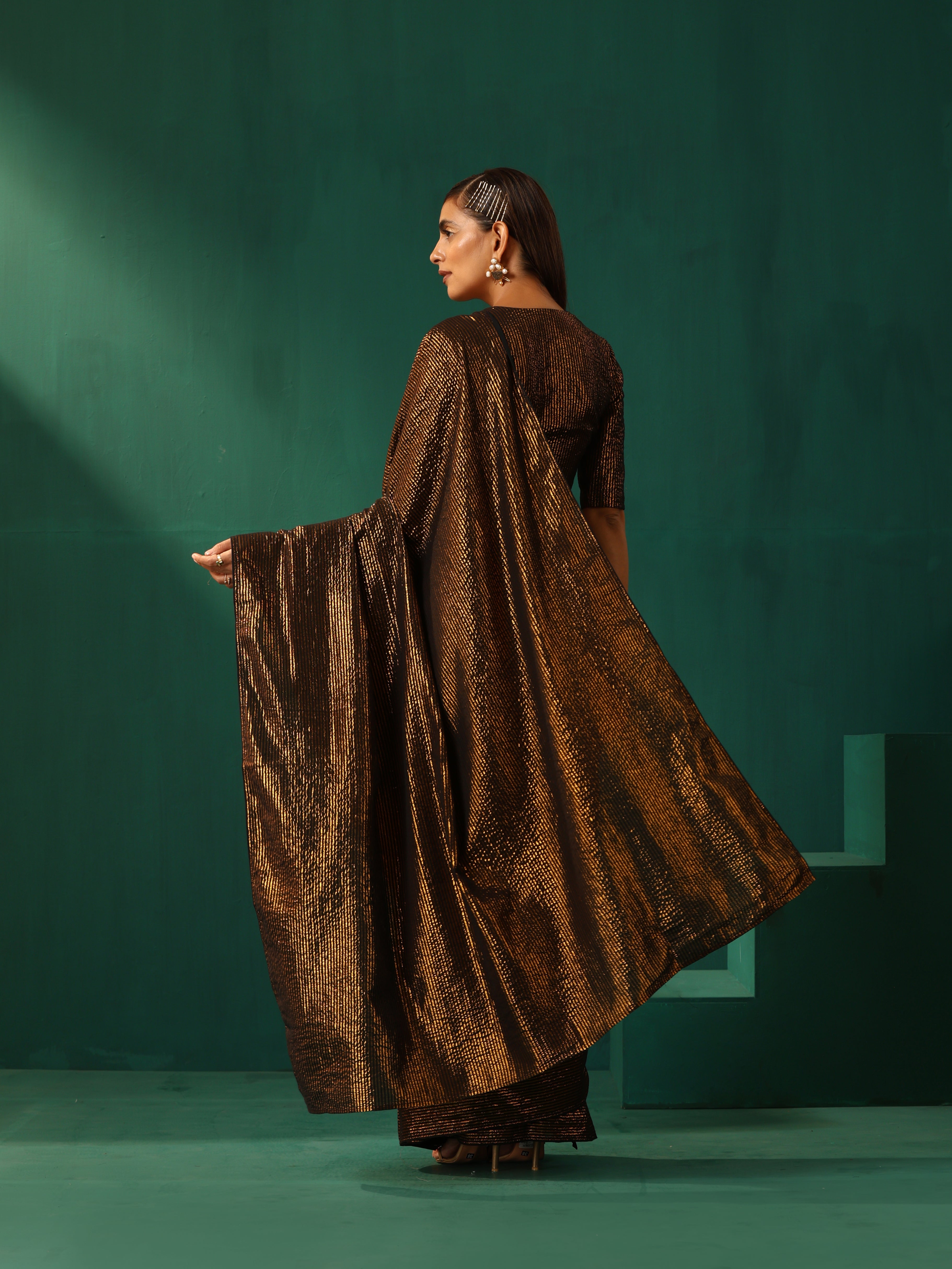 trueBrowns Black Cotton Gold Lurex Striped Ready to Wear Saree - Distacart