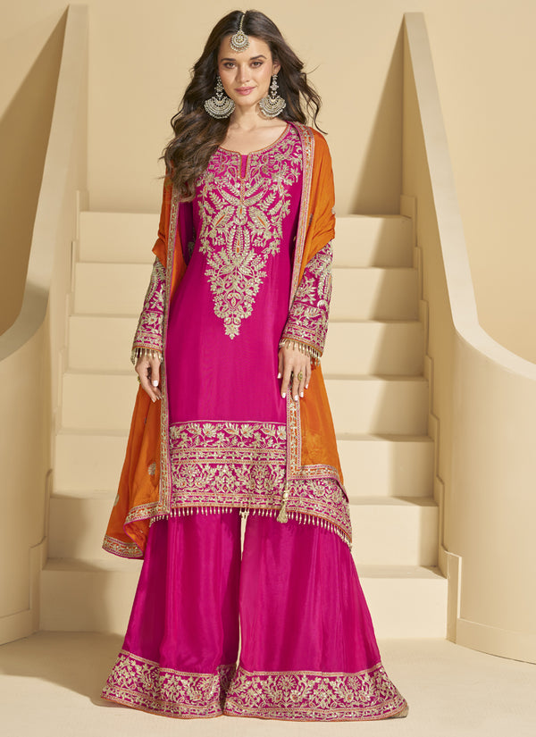 Vegaa Fashion Pink Chinon Silk Embroidered Palazzo Suit