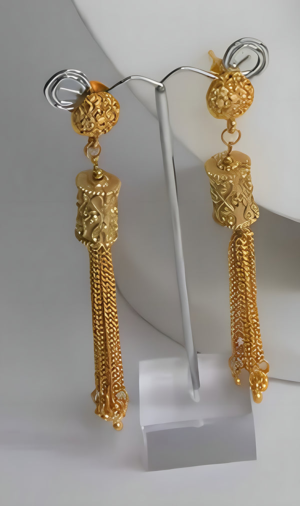 This timeless piece combines traditional craftsmanship with contemporary style, making it a versatile addition to any jewelry collection. The ornate gold work showcases expert artisanship, while the tassel elements add a touch of drama and movement.