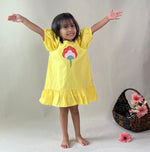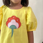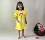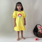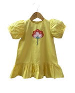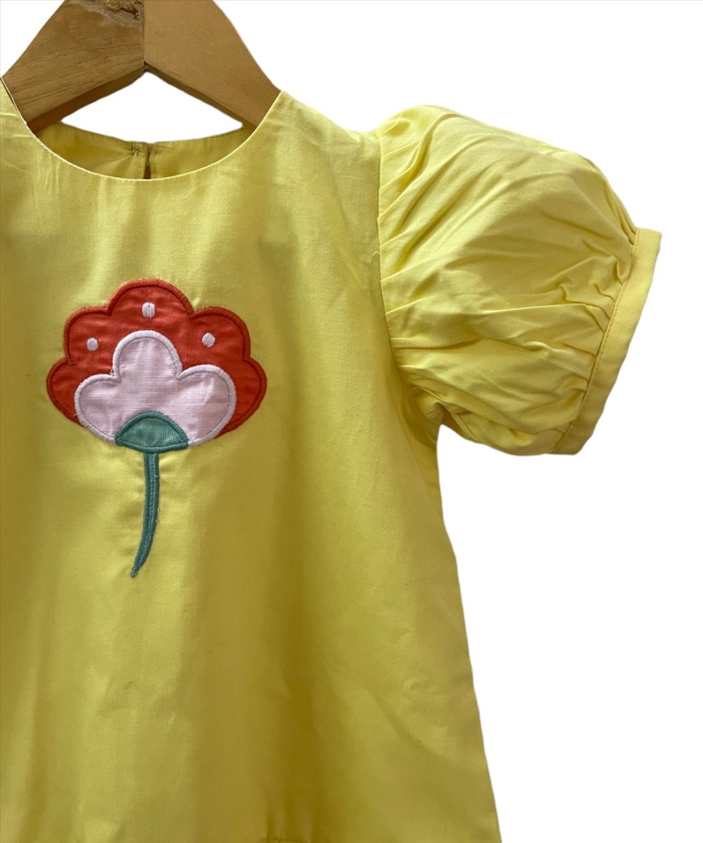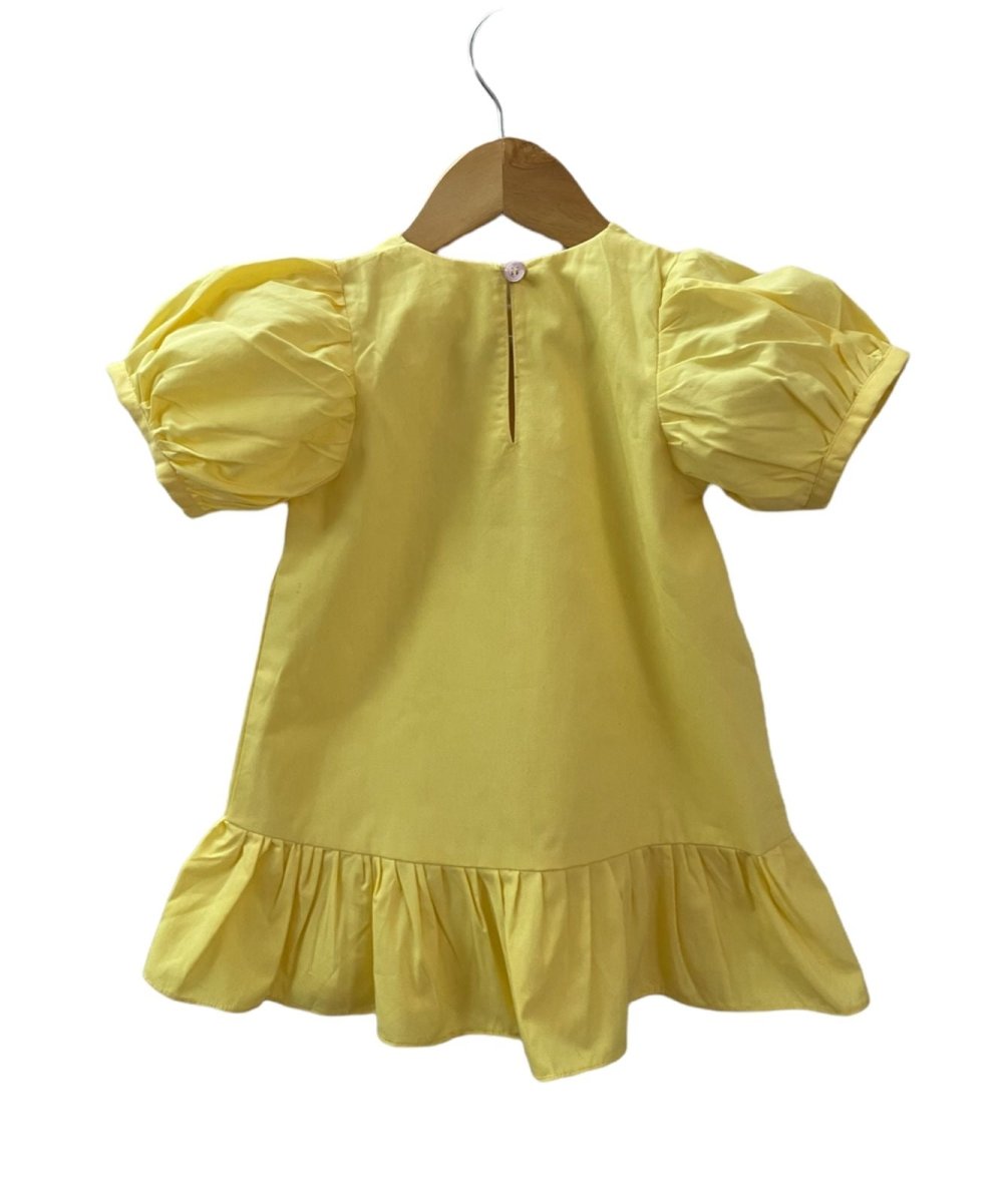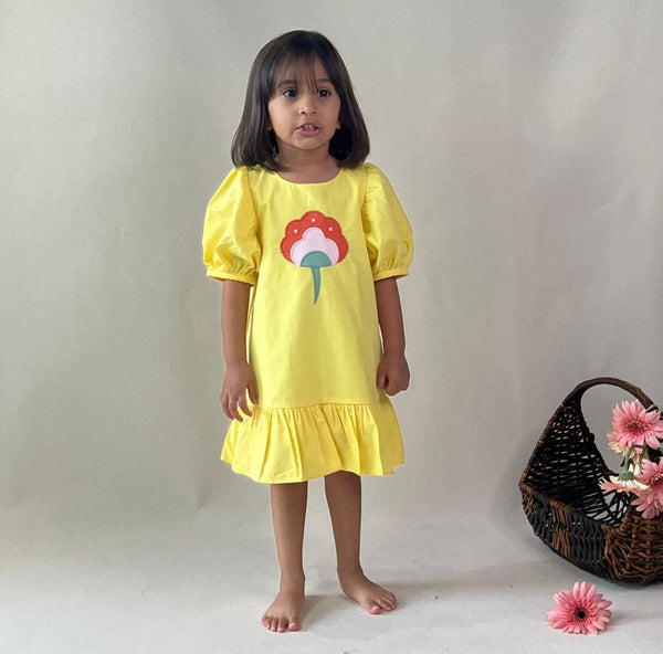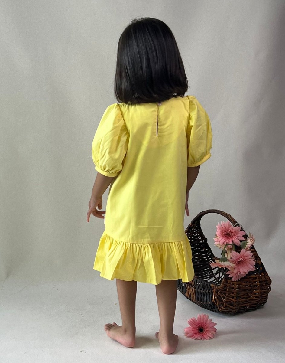 Add a pop of sunshine to your little one's wardrobe with this stunning yellow A-line dress. Featuring a charming flower patchwork on the yoke and playful pleated ruffle on the hem, this dress is perfect for any occasion. The puff sleeves add an extra touch of cuteness, making it a must-have for any stylish kid.