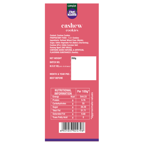 Ingredients:  Refined Wheat Flour(45 %),Sugar, Edible Vegetable Fat, Cashew, Edible Common Salt, Raising Agent [INS 500(ii)], CONTAINS ADDED NATURAL & ARTIFICIAL FLAVOURING SUBSTANCES (Vanilla)