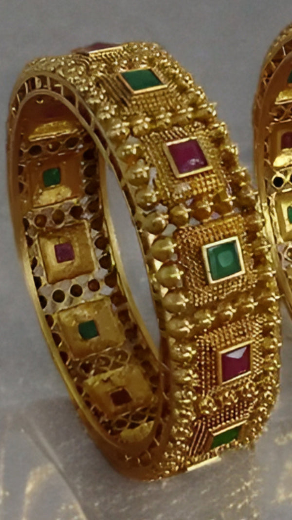 Step into timeless tradition with these exquisite gold-plated temple design bangles, intricately handcrafted with vibrant ruby red and emerald green stones. These classic ethnic kada-style bangles are the perfect blend of regal charm and heritage artistry, ideal for women who love flaunting traditional elegance at special occasions. Crafted with precision using high-quality alloy with a rich gold polish, each bangle features a detailed lattice pattern adorned with alternating colored square stones. The bold design, combined with intricate texture work, brings out the grandeur of South Indian temple jewelry, making it a standout accessory for weddings, festivals like Navratri & Diwali, traditional events, and bridal trousseaus. Whether paired with a saree, lehenga, or salwar kameez, these bangles elevate your ensemble instantly with their majestic appeal.
