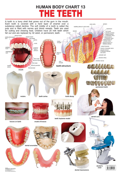 The human body, a remarkable biological machine is composed of many different types of cells that together create tissues and subsequently organ systems. Our teeth are one of the strongest parts of our body. ‘The Teeth’ – this wall chart includes detailed images of the teeth with all important information in an easy-to-read and simple-to-understand text.