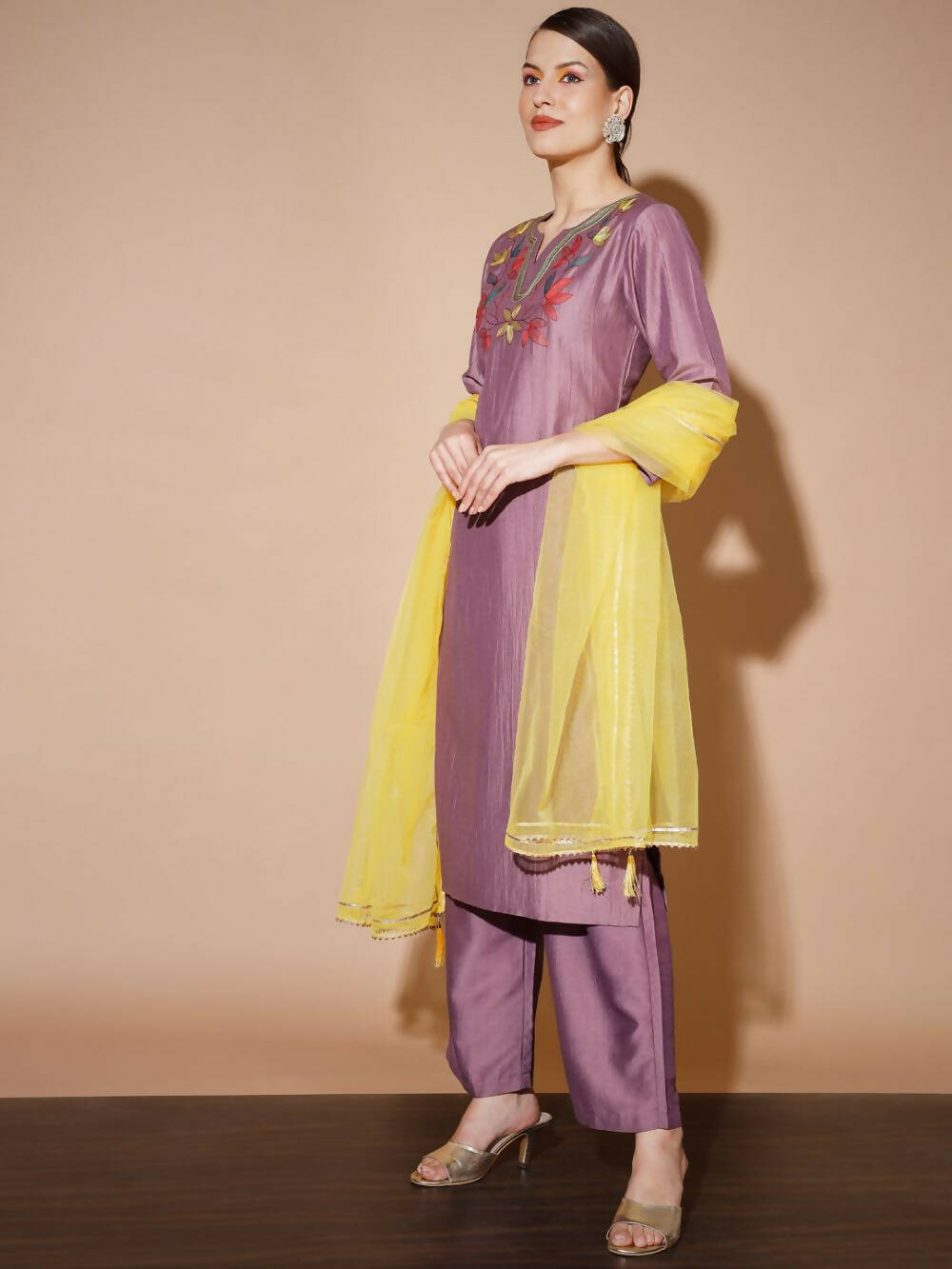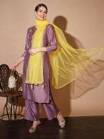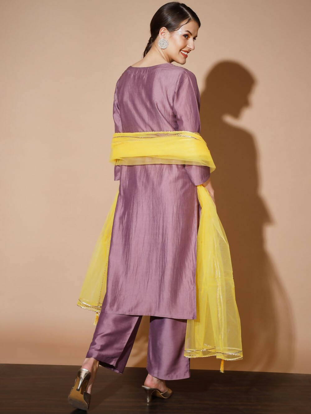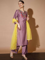 Myshka Mauve Solid Kurta & Palazzos With DupattaMauve Three-Quarter Sleeves U-Neck Silk Blend Kurta Sets Embroidered Straight Calf Length Kurta...