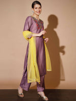 Mauve Three-Quarter Sleeves U-Neck Silk Blend Kurta Sets Embroidered Straight Calf Length Kurta Palazzos Net Solid Tassels With Dupatta