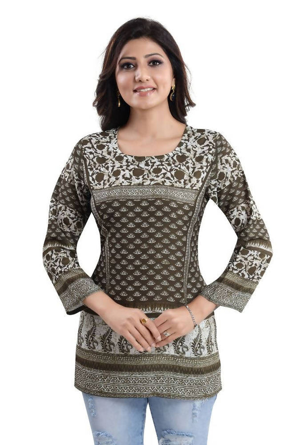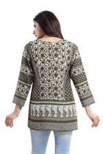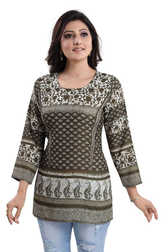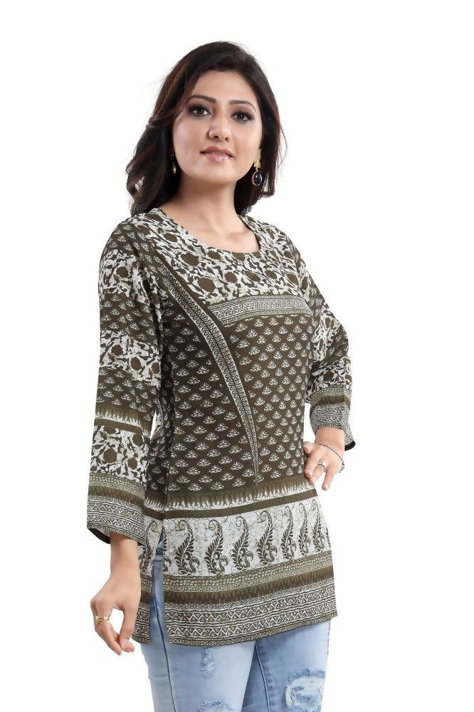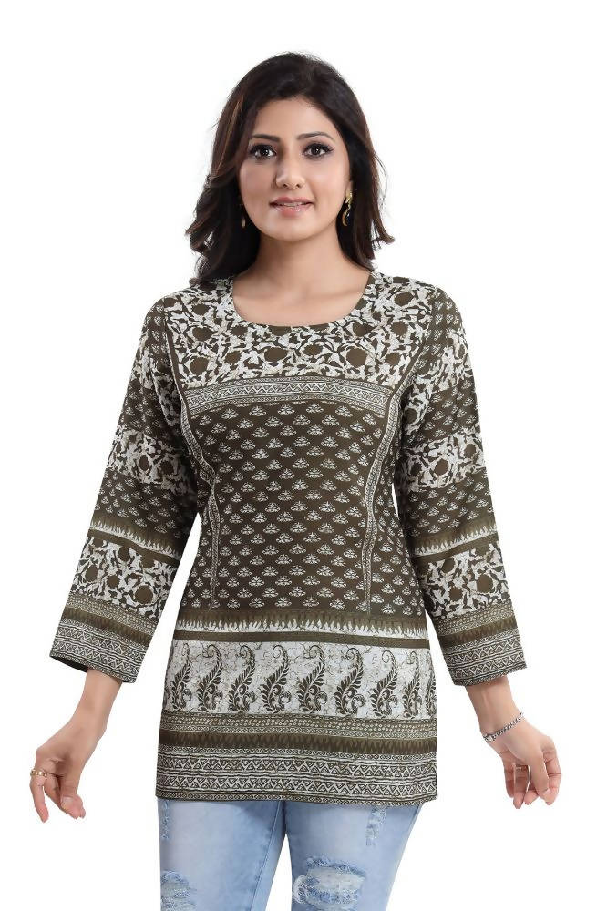 Make your summer outfits happen by wearing this trendy and admirable mehendi green summer cool printed short kurti tunic top solely sold by Snehal Creation. It is a simple yet graceful short length kurti with long sleeves that will save your arms from tanning. It has got a round neckline which accentuates the neck and has double print work going all over the kurti. If you want to amp up the look, you can add your sleek pair of jhumkas. The kurti is made from the finest quality of summer cool fabric which is very breathable. This kurti can be washed in a washing machine thus saving your time.