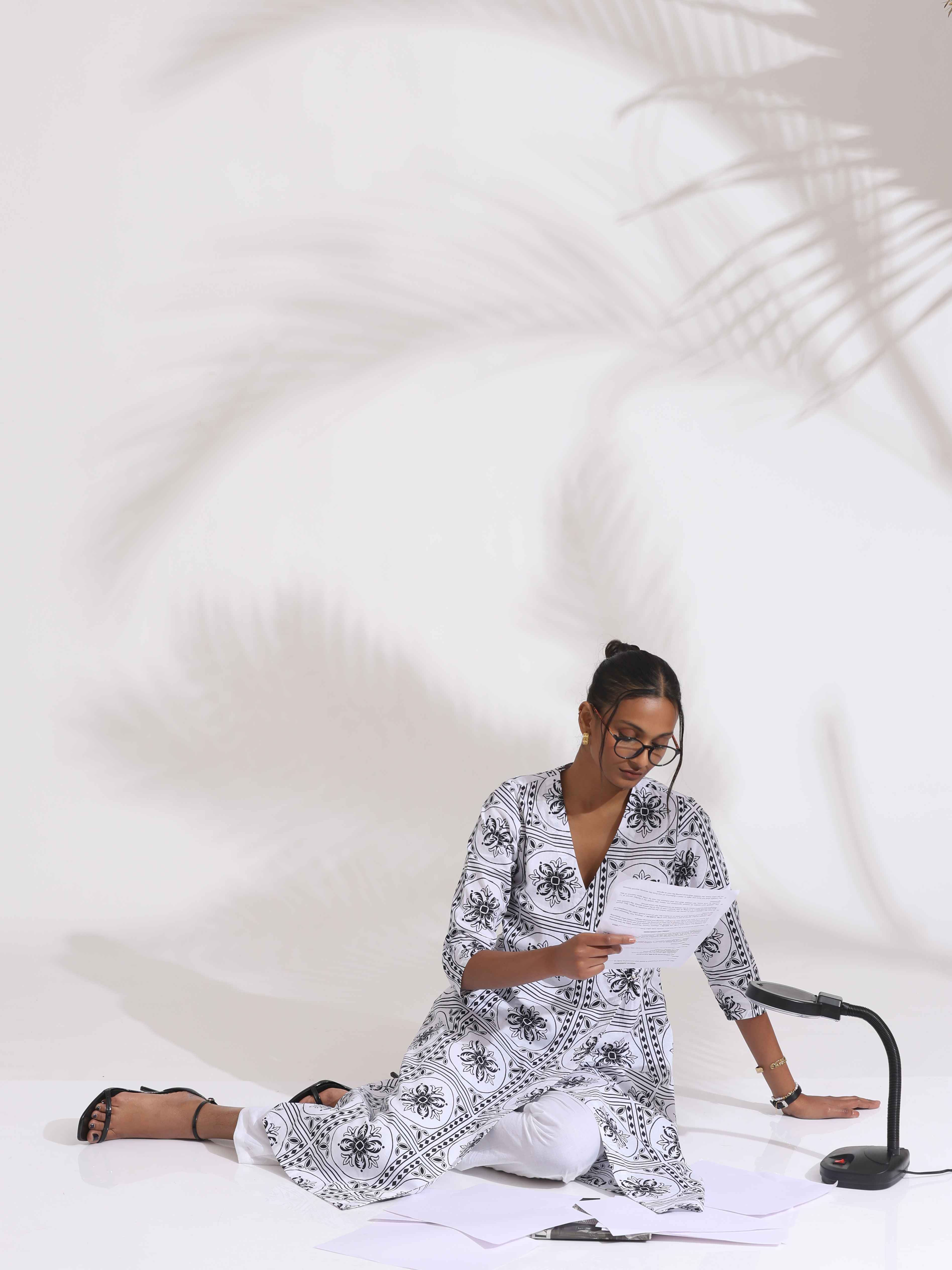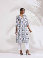 trueBrowns White Cotton Geometric Print Angrakha Kurta Set