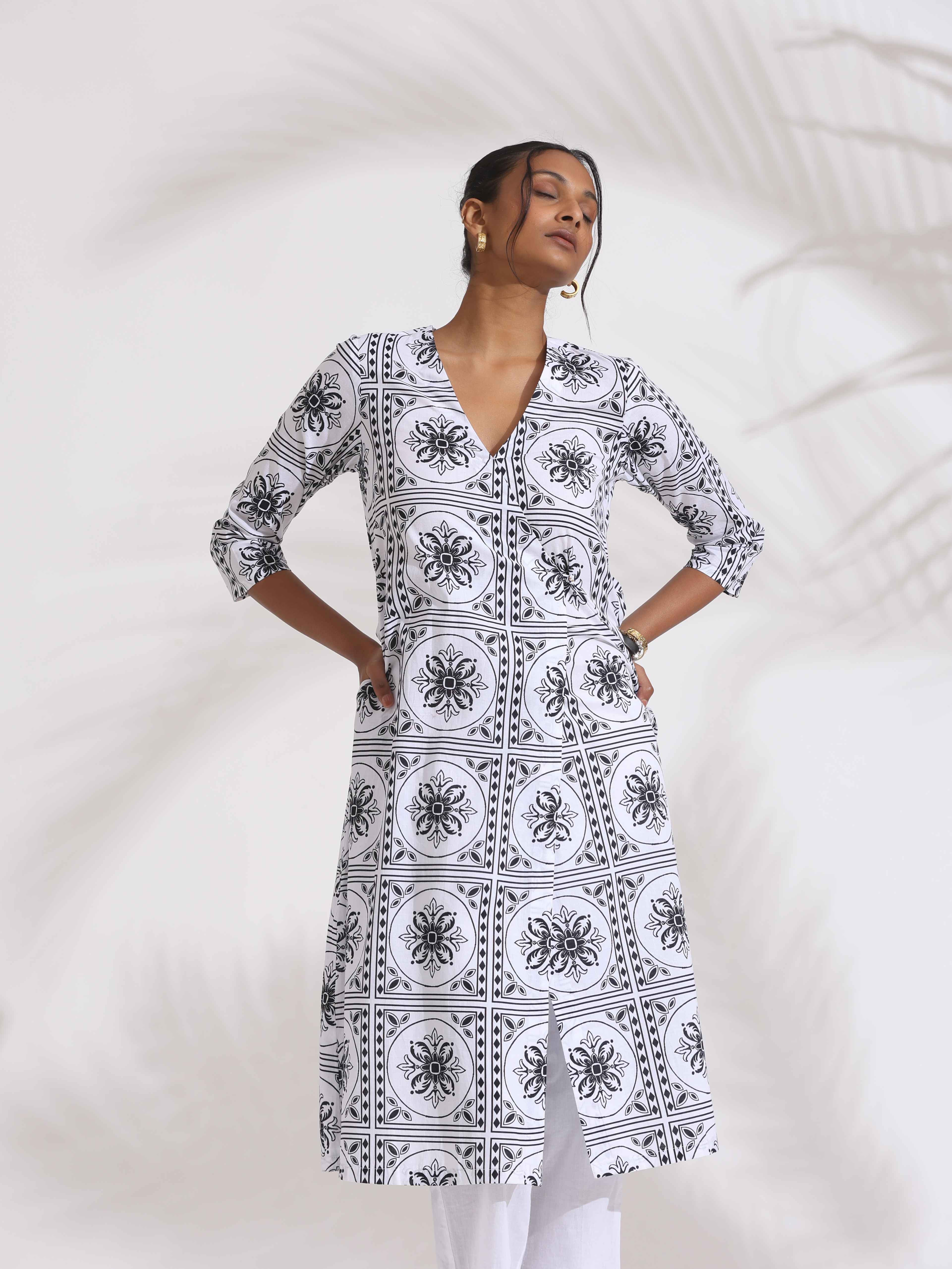 trueBrowns White Cotton Geometric Print Angrakha Kurta SetDescription Elevate your style with this stunning white cotton geometric print angrakha k...