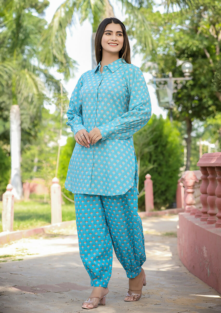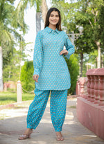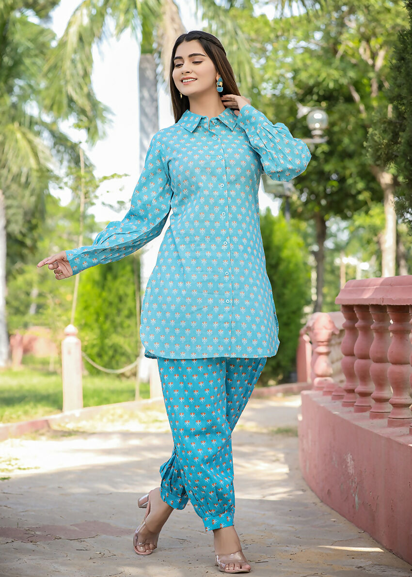 Kaajh Women's Sky Blue Printed Cotton Kurta Pant Set