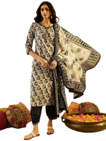 NOZ2TOZ Women's Floral Printed Knee Length V Neck Kurti And Pant Set With Printed Dupatta - Black