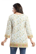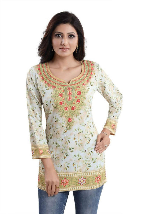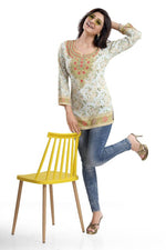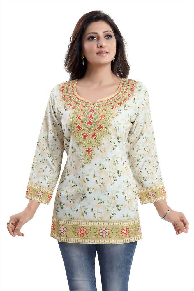 Rejuvenate your summers by adding this Adorable Faux Crepe Printed Short Kurti Tunic Top solely made by Snehal Creation. It has got detailing of borders on cuffs, bottom as well as the neck which makes it stand out from the crowd. The lively color combination makes it appropriate for a hot summer day out. Since it is short in length, it can be paired with jeans and create an indo-western look. The neckline is neither too deep nor too covered, which makes it one of the most comfortable tunics for every day.