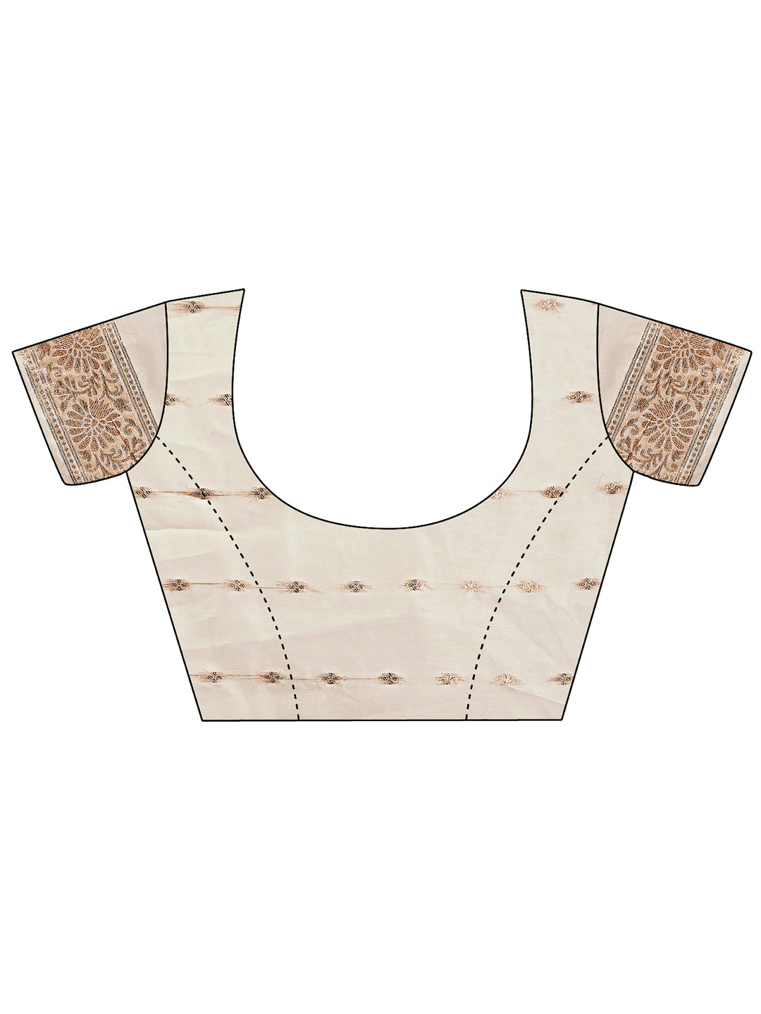 Exude sophistication with this elegant beige and coral linen saree, masterfully designed with a contemporary abstract print and finished with a traditional zari-woven border and pallu. The serene beige base is accentuated with soft coral strokes, blending minimalism with modern flair.Crafted from breathable, lightweight linen fabric, this saree offers unmatched comfort, making it perfect for long events, office wear, or festive gatherings. The rich brocade-style pallu and border, paired with a stylish grey-toned blouse featuring ornate golden sleeves, adds a regal touch to your ensemble.Whether you're attending a family celebration, cultural event, or professional gathering, this saree ensures you look poised and graceful.