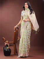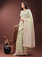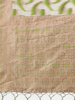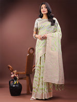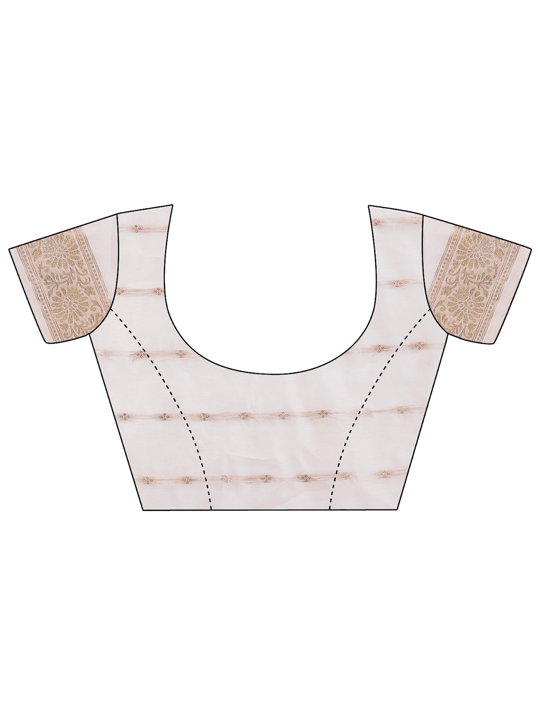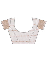 Exude sophistication with this elegant beige and coral linen saree, masterfully designed with a contemporary abstract print and finished with a traditional zari-woven border and pallu. The serene beige base is accentuated with soft coral strokes, blending minimalism with modern flair.Crafted from breathable, lightweight linen fabric, this saree offers unmatched comfort, making it perfect for long events, office wear, or festive gatherings. The rich brocade-style pallu and border, paired with a stylish grey-toned blouse featuring ornate golden sleeves, adds a regal touch to your ensemble.Whether you're attending a family celebration, cultural event, or professional gathering, this saree ensures you look poised and graceful.