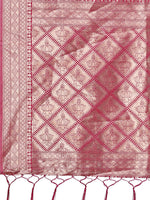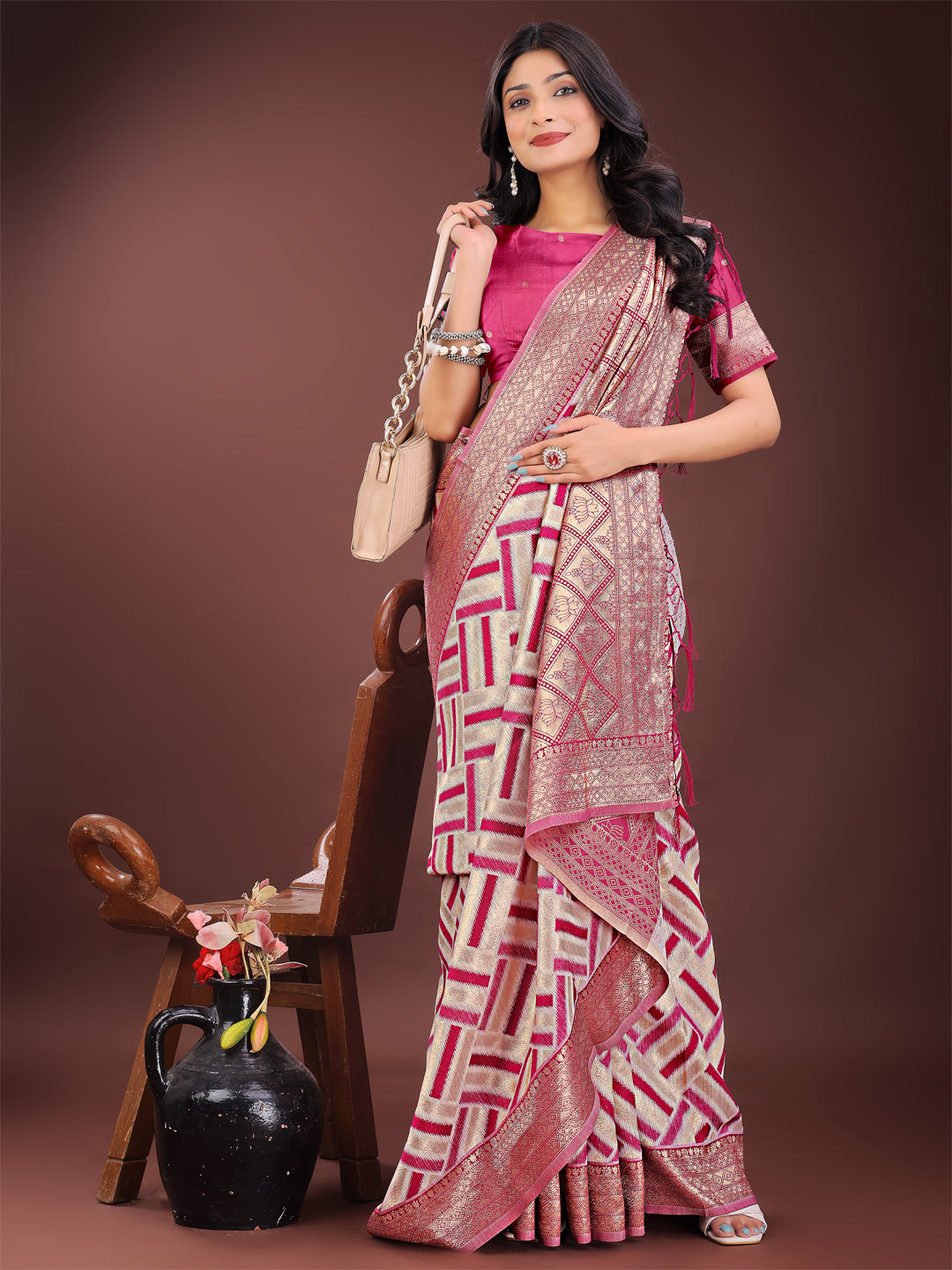 Step into timeless elegance with this exquisite linen saree featuring a striking pink and cream geometric pattern complemented by a rich metallic zari border and pallu. Crafted with fine attention to detail, this saree blends tradition with contemporary flair—perfect for festive occasions, cultural events, or stylish celebrations. The soft linen fabric ensures breathable comfort while offering a structured drape, enhancing your graceful silhouette.Paired with a matching contrasting blouse in deep magenta, this saree effortlessly balances bold patterns with classic luxury. Whether you're attending a wedding, party, or special gathering, this saree guarantees a look that's both eye-catching and sophisticated.