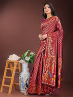 Bring alive your most beautiful moments with this vibrant copper-toned Banarasi silk saree, beautifully woven with intricate Magenta motifs and a stunning multicolor pallu. This saree celebrates tradition while adding a splash of color and modern elegance. Perfect for weddings, festivals, and special gatherings, it effortlessly blends grace with joyful expression. Feel the richness of culture and the warmth of festivities wrapped around you.