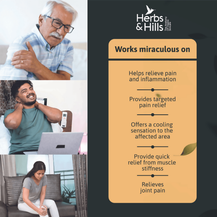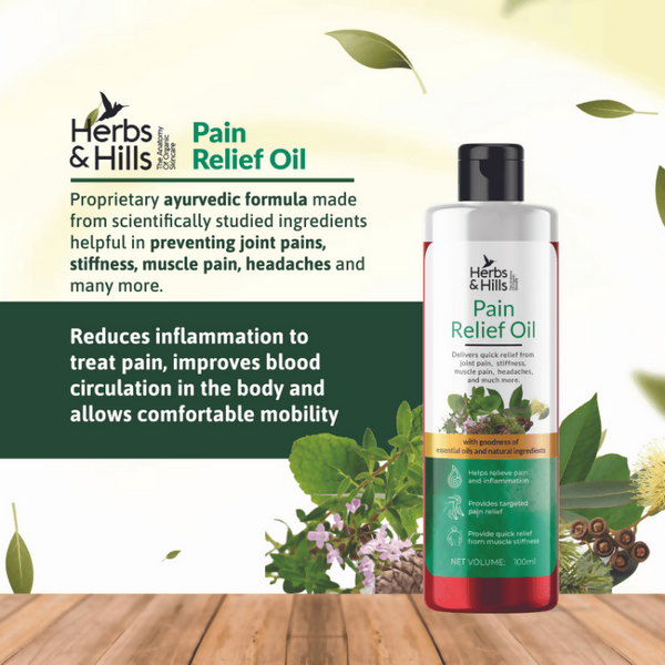• Bid farewell to the persistent joint pain or stiffness with the perfect solution that is Herbs and Hills 100% Ayurvedic pain relief oil. Crafted with the goodness of essential oils and natural ayurvedic ingredients including Menthol Crystal, Thymol oil, Nilgiri Leaf Oil, and Camphor, it proves to be an excellent way to provide quick relief from joint pain, stiffness, muscle pain, headaches and more. The power of time-tested effective vedic and ayurvedic principles are designed with care to strengthen muscles, reduce inflammation, enhance blood circulation and ensure comfortable mobility. Experience the transformative qualities of your all-time reliable companion in pain relief and holistic wellness.